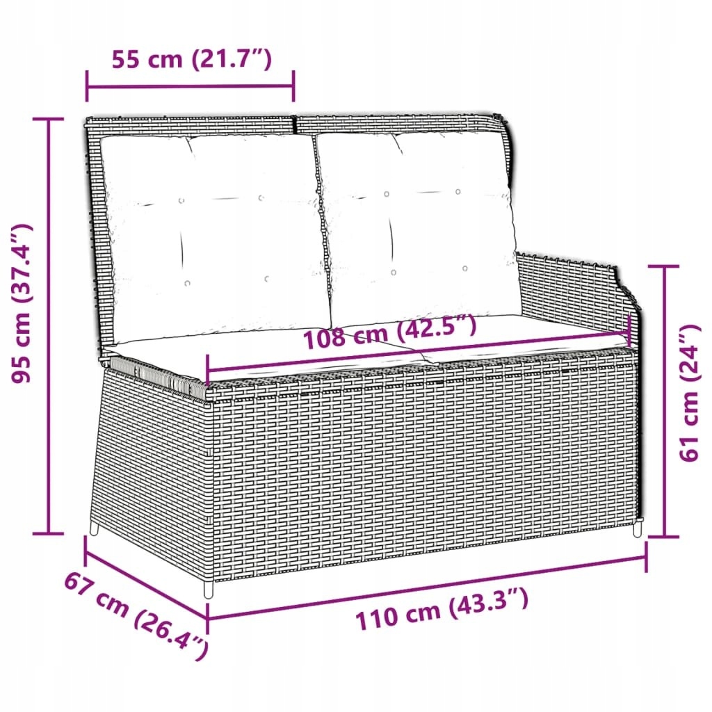 - Розміри в положенні лежачи: 110 x 95 x 85 см (Ш x Г x В)