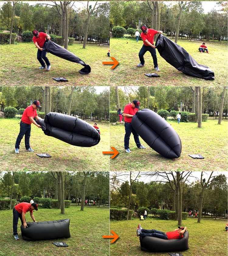 Легкий і простий у використанні портативний диван, наповнений повітрям без накачування чи продування. Матеріал, з якого виготовлений диван - це нейлонове волокно Ripstop, що робить диван дійсно міцним. Завдяки невеликій вазі та невеликим розмірам ви можете брати його куди завгодно після упаковки. Диван має два великі отвори для «ловлення» повітря, тому наповнення його повітрям займає кілька секунд.