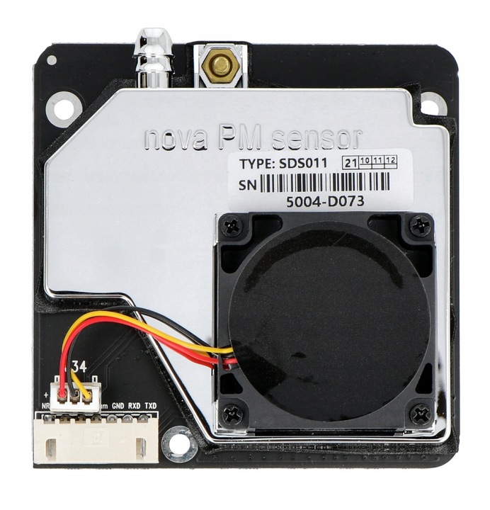 Лазерний датчик пилу, що дозволяє контролювати чистоту повітря. Він дозволяє виявляти частинки діаметром понад 0,3 мкм, призначений для вимірювання значень PM2,5 і PM10. Має вентилятор, який всмоктує повітря. Система живиться від напруги від 4,7 В до 5,3 В і обмінюється даними через сигнал UART або ШІМ.