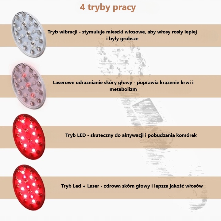 4 Для відновлення волосся! Цей вдосконалений пристрій використовує останні лазерні та світлодіодні технології для ефективного стимулювання волосяних фолікулів, покращення кровообігу та підтримки здорового росту волосся. З його допомогою ви можете не лише запобігти випадання волосся, але й стимулювати їх зростання, забезпечуючи себе щільнішим, здоровим і сильнішим волоссям.