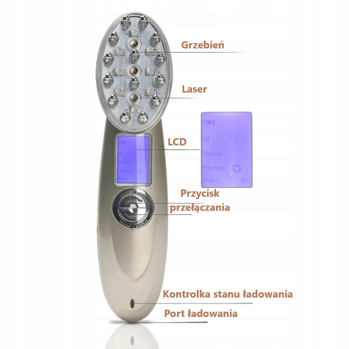 - EMS (стимуляція м’язів) : Спеціальні струми EMS стимулюють рух м’язів, підтримуючи ріст волосся та покращення шкіри еластичності Без ризику його пошкодження.