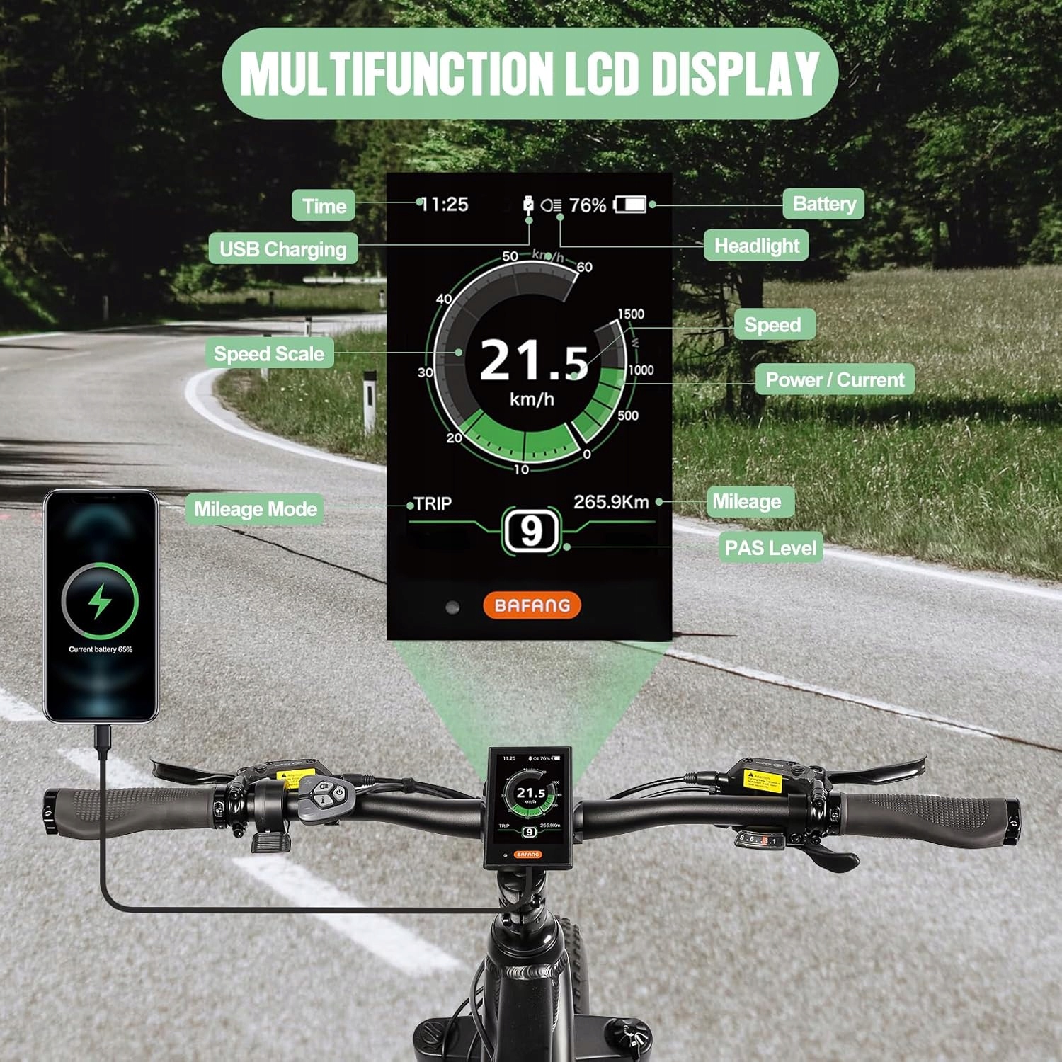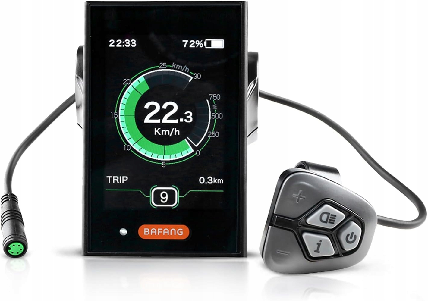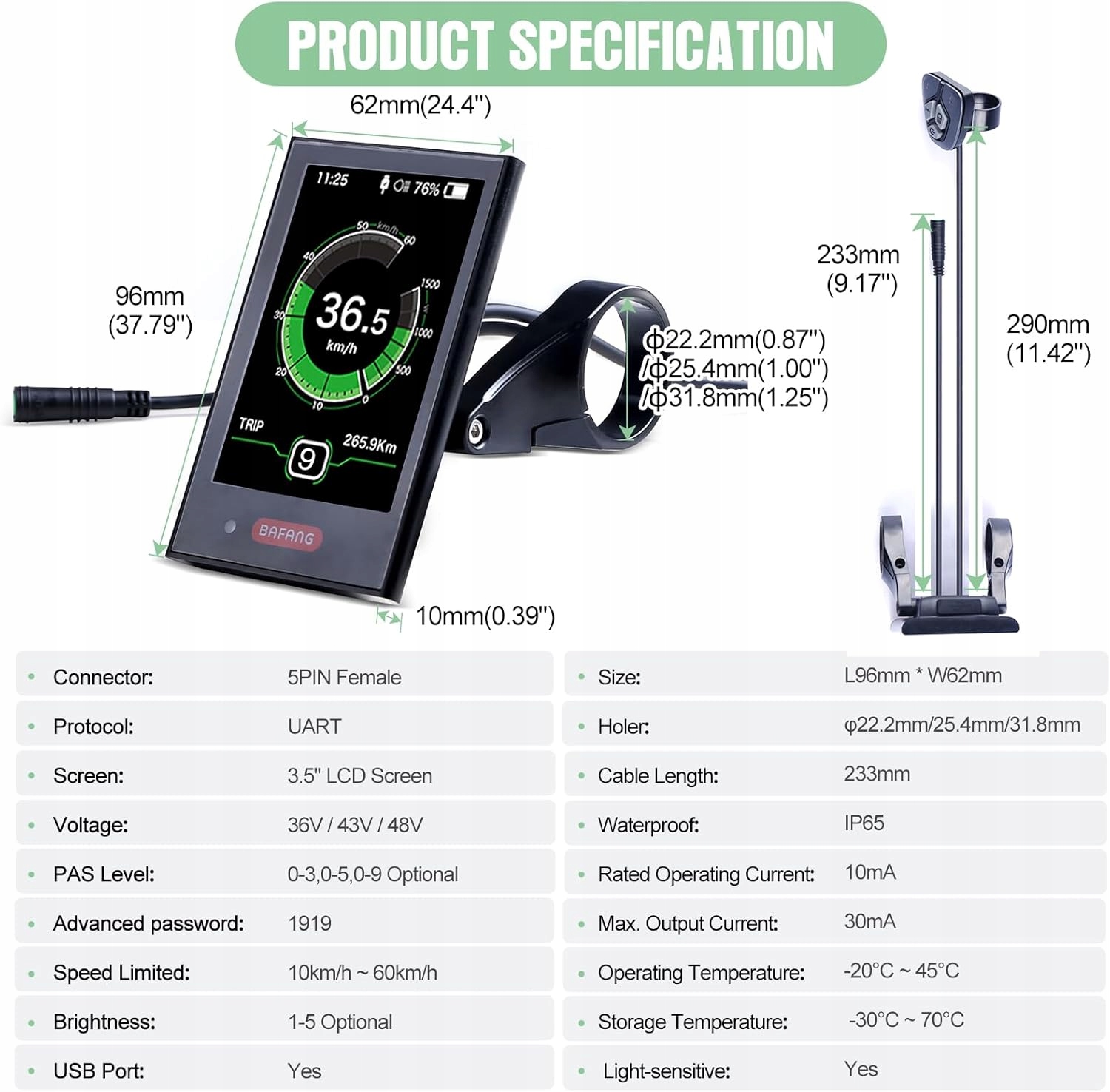 [Зовнішній вигляд і матеріал] Кольоровий TFT-екран із діагоналлю 3,5 дюйма та зовнішня 5-кнопкова клавіатура, корпус виготовлено з ПК, а рідкокристалічний дисплей із загартованого ПММА. Елегантний і сучасний дизайн ефективно передає ключові дані про поїздку через висококонтрастний РК-екран [Функції та функції], включаючи автоматичне світлочутливе освітлення, 5 рівнів вимкнення підсвічування, USB-порт для заряджання, вибір режиму підтримки рівня: 0-3/0-5/0-9 (без перетворення режимів ECO та Sport), потужність двигуна W для їзди, вихідний струм A, діапазон інших кілометрів, споживання енергії, калорії тощо.
