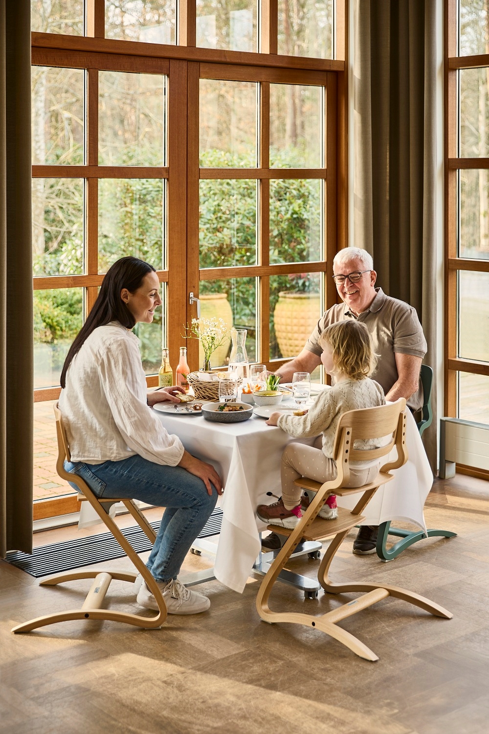 - З дитячим стільчиком LEANDER малюк або дитина старшого віку може їсти їжу з сім'єю за спільним столом