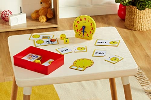 Опис продукту Освітні ресурси Набір вправ на час. Все, що вам потрібно для навчання молодих студентів цифровому та аналоговому часу, в одній коробці. Цей повний набір завдань включає три ігрові кубики (з цифровим часом), 24 двосторонні аналогові та цифрові картки-головоломки, 12 двосторонніх карток завдань, годинник для запису та стирання та один навчальний годинник із кольоровими годинниковою та хвилинною стрілками. Пластиковий годинник висотою 13 см. Підходить для дітей віком від 5 років. Попередження про безпеку. Небезпека задухи - дрібні деталі. Коробка містить три кубики часу (з цифровим часом), 24 двосторонні аналогові та цифрові картки-головоломки, 12 двосторонніх карток завдань, годинник для запису та стирання та один навчальний годинник із кольоровими годинниковою та хвилинною стрілками. містить багатомовний вичерпний посібник для вчителів