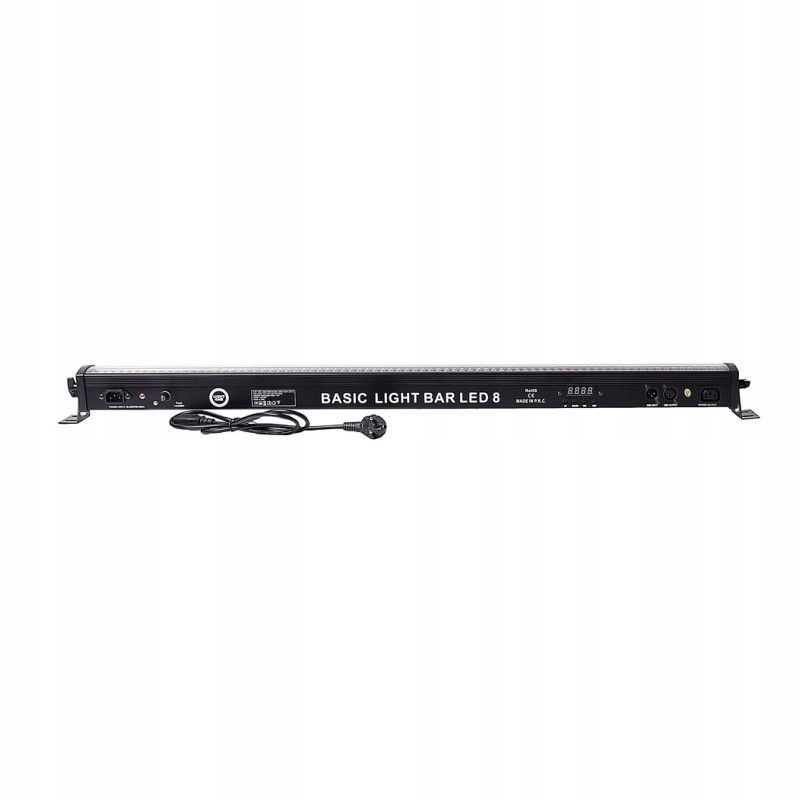 LIGHT4ME BASIC LIGHT BAR LED 8 RGB MKII IR - професійна тонка світлодіодна стрічка на 8 секцій з можливістю дистанційного керування, робочого світла в колірній палітрі RGB. Діоди можна розділити на 8 сегментів. Завдяки цьому лише кілька смуг, підвішених вертикально, створюють матрицю з багатою комбінацією візерунків. Світлодіодний промінь простий у використанні. Панель управління складається з цифрового світлодіодного дисплея та чотирьох кнопок. Ним можна керувати за допомогою бездротового пульта дистанційного керування, працювати в автоматичному режимі, режимі керування звуком, у конфігурації головний/підлеглий або під контролером DMX. Завдяки роз'єму «передай далі», який дозволяє подавати напругу безпосередньо від пристрою до пристрою, а також гнізда XLR для передачі сигналів DMX, світлодіодні панелі можна з'єднувати між собою групами. Ніжки, що входять в комплект, дозволяють поставити освітлювач на підлогу і прикрасити світлом будь-який елемент інтер'єру та архітектури.