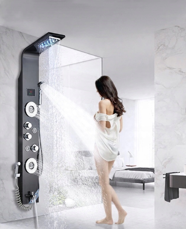 Це ексклюзивна, стильна, сучасна душова панель з гідромасажем, водоспадом, тропічним душем і світлодіодними діодами.