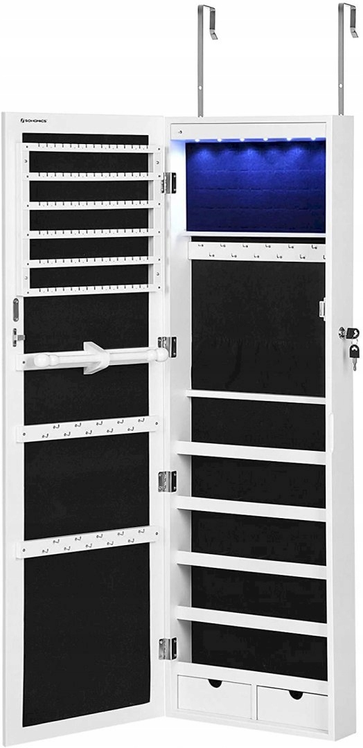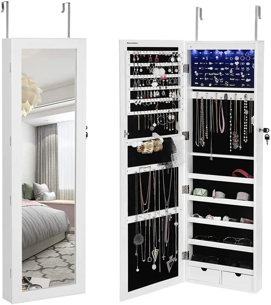 Шафа для ювелірних виробів Songmics із дзеркалом; для дверного/настінного кріплення; закривається, з LED підсвічуванням; висота 120 см JBC93 W