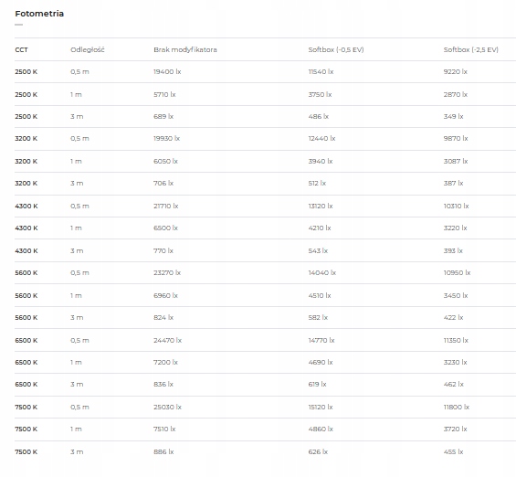 - інтенсивність світла без додаткових модифікаторів макс. 25030 люкс (на відстані 0,5 м)