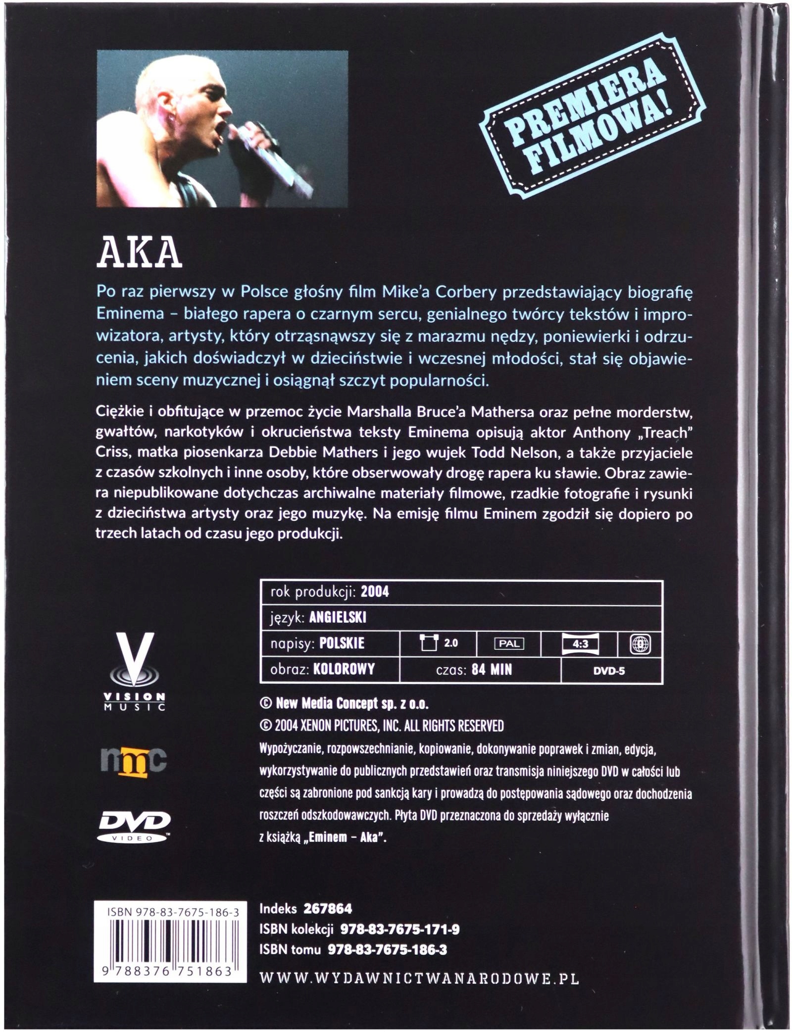Вперше в Польщі відомий фільм Майка Корбері, який представляє біографію Емінема – білого репера з чорним серцем, блискучого лірика та імпровізатора, художника, який, потрясши Покинувшись із заціпеніння бідності, нещастя та неприйняття, які він пережив у дитинстві та ранній юності, став одкровенням на музичній сцені та досяг піку популярності. Важке й насильницьке життя Маршалла Брюса Мезерса та тексти Емінема про вбивства, зґвалтування, наркотики та жорстокість описують актор Ентоні Тріч Крісс, мати співака Деббі Мезерс та його дядько Тодд Нельсон, а також шкільні друзі та інші, хто дивився фільми репера шлях до слави. Картина містить неопубліковані раніше архівні кадри, рідкісні фотографії та малюнки дитинства художника, його музику. Емінем погодився на трансляцію фільму лише через три роки після його виробництва. мова: англійська субтитри: польська тривалість: 84 хв. Збірка «Легенди музики Речі Посполитої». У набір входить книга з невідомими фактами з життя Емінема-Ака + фільм на DVD.