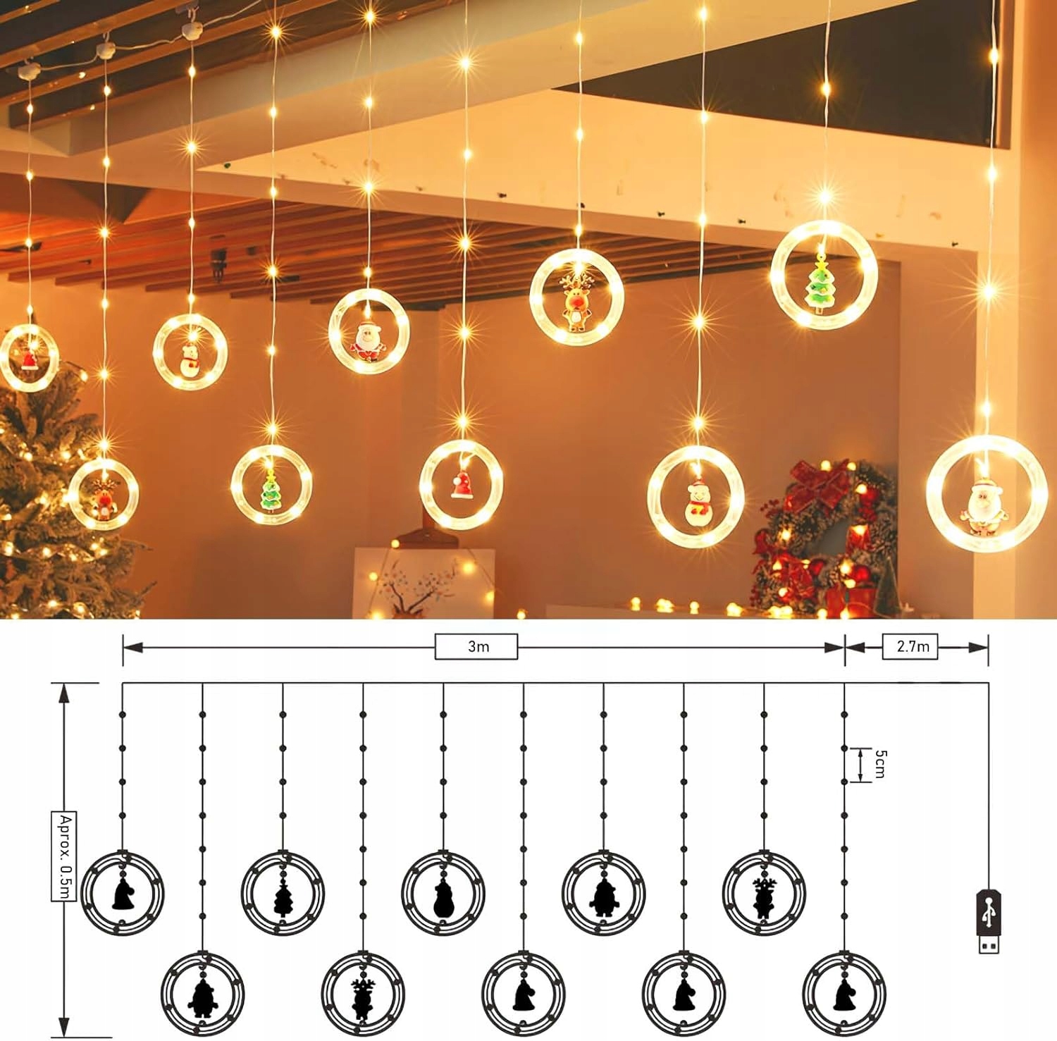 Світлова завіса складається з 10 вертикально підвісних проводів, на яких розміщені мікропровідники. На кінцях є світиться колеса, в яких можна прикріпити декоративні різдвяні статуетки. Така прикраса буде ідеальною в дитячій кімнаті, але також на балконному вікні чи вікна магазину. Світло має теплий, приємний колір, а також виявляється флеш -ефектом, який вводить трохи динаміки до цієї прикраси.