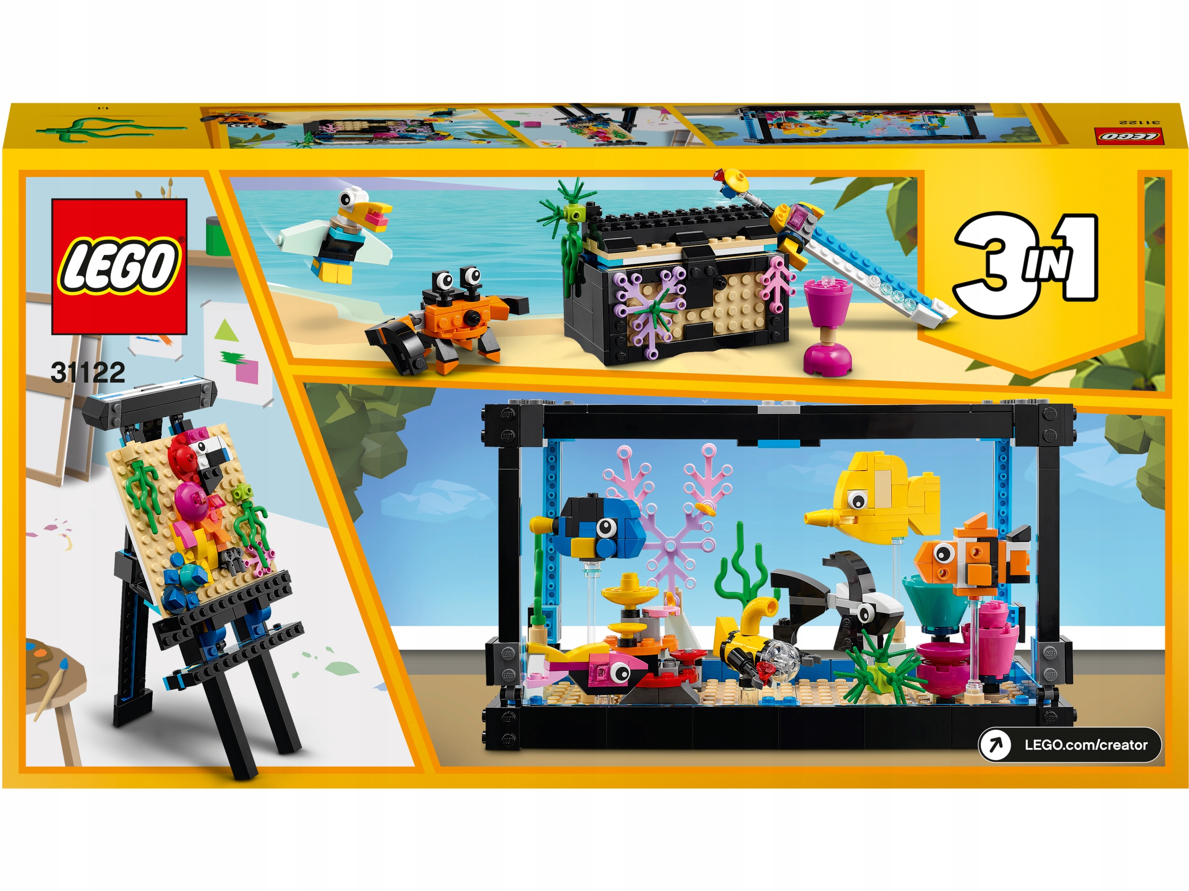 LEGO® Creator 3 в 1 акваріум (31122) запрошує дітей приймати підводні пригоди. П'ять різних яскравих рибних плавців у акваріумі без скла: клоун, шип, кардинальний апогон, жовта зебра та антія. Також є мініатюрна підводна човна, коралова та підводна рослина. Потрійна гра з одним набором! Цей набір 3 в 1 Lego 3 в 1 пропонує 3 надзвичайно детальні моделі для створення та гри. Діти можуть побудувати акваріум з чудовою рибою, відновити їх у стійку або скарбницю, а потім створити те, що їм скаже їхня уява! Креативні подарунки для Creative Fun 3 в 1 набори від Creator Lego містять три різні моделі для створення, кожна пачка! Вболівальники LEGO люблять цей вибір. Серія Creator 3 в 1 забезпечить дітям розваги протягом багатьох годин, і всі знайдуть щось для себе серед моделей космічних поромів, смішних парків розваг та бойових замків.