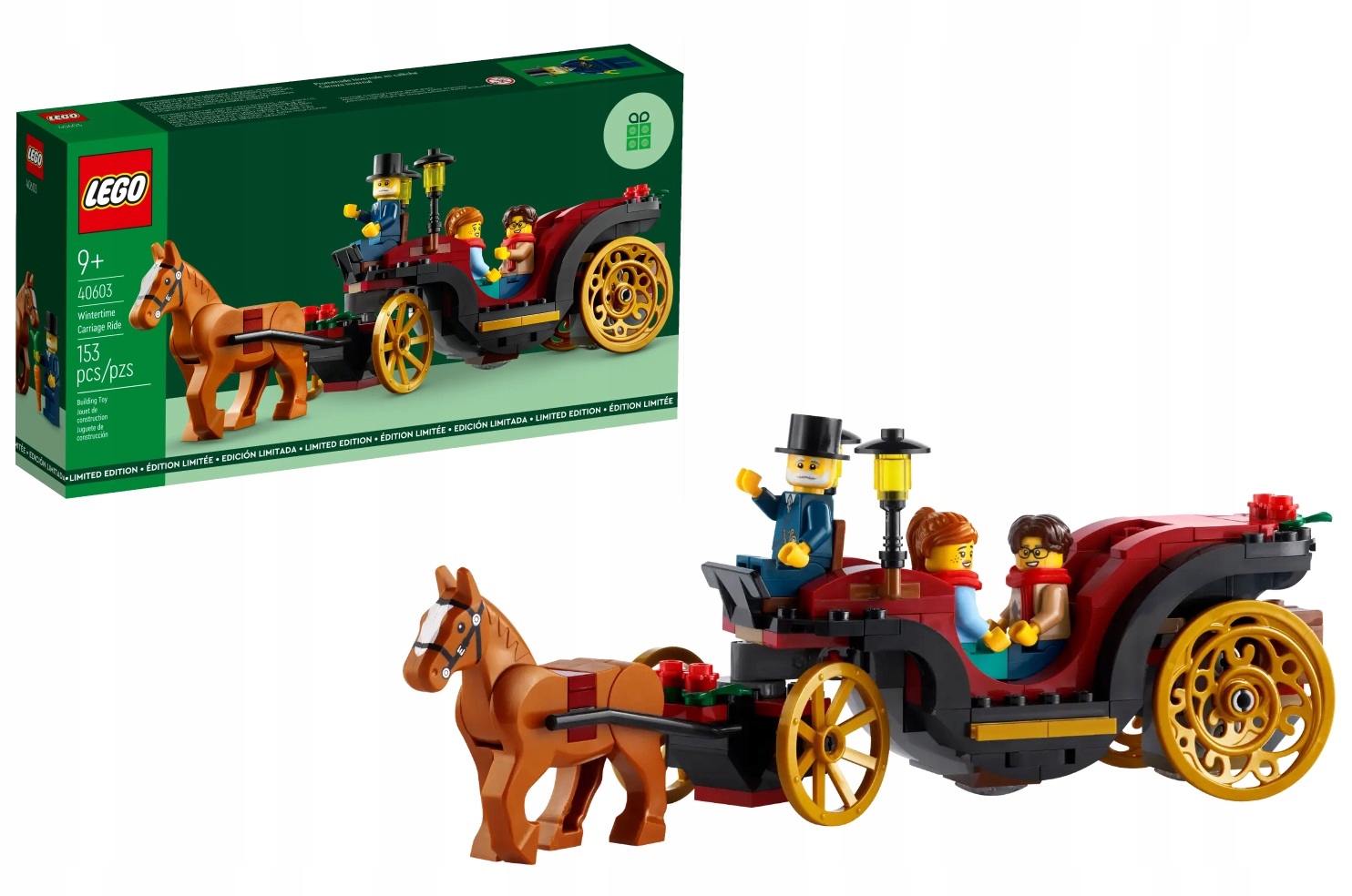 - Катання на різдвяних санях – LEGO® Winter Sleigh Ride (40603) містить карета з бордовим салоном, золотими колесами та багажником