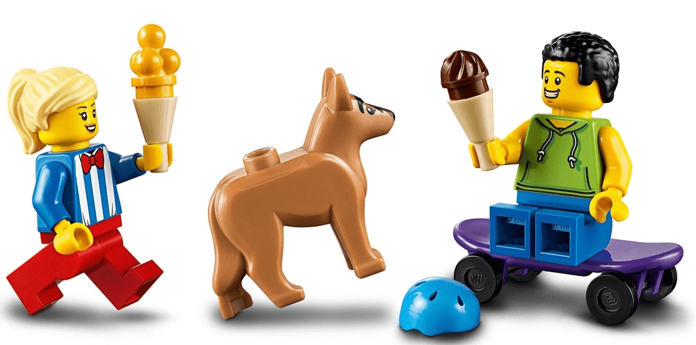✔️ Конструктор для дітей містить барвисту вантажівку з морозивом, мініфігурки продавчині та скейтбордиста, а також фігурку собаки.