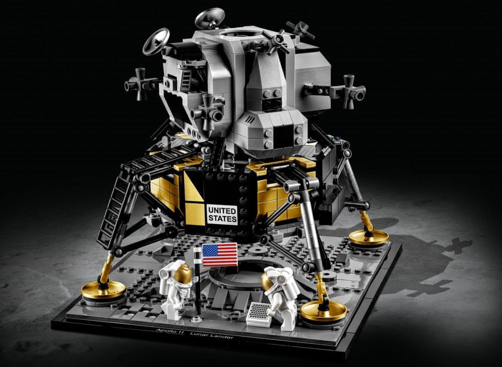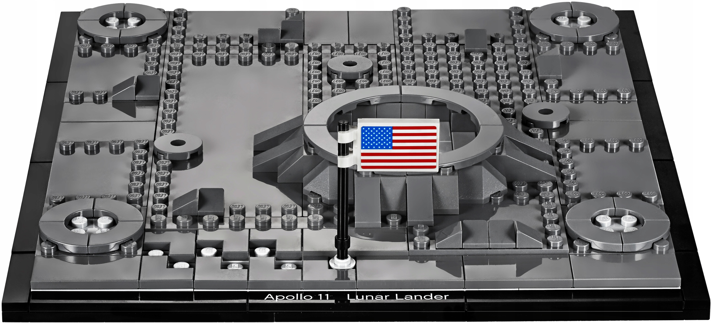 - Удосконалений набір LEGO® із детальною копією місячного посадкового модуля Eagle з окремими ступенями підйому та спуску, що стоїть на поверхні Місяця з кратером, слідами та американським прапором.