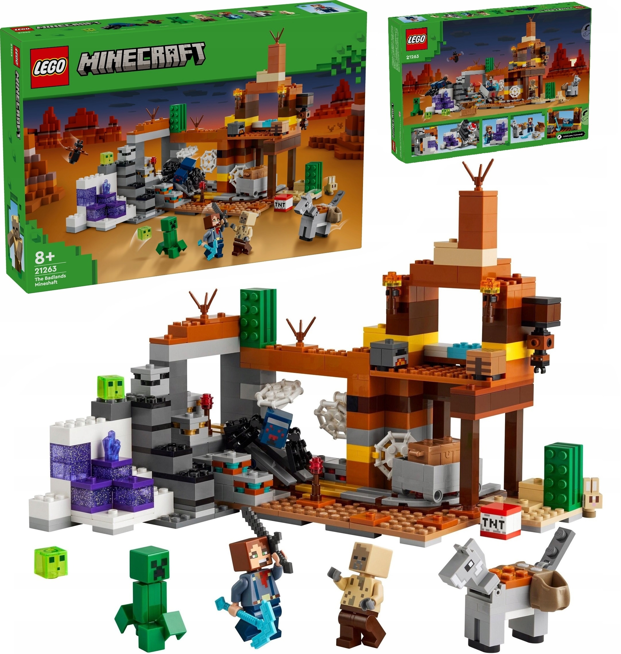 The Badlands Mine (21263) — це практичний набір для гравців Minecraft®. У цій універсальній іграшці-конструкторі для дітей є популярні персонажі натовпу Minecraft і стане чудовим подарунком для хлопчиків і дівчаток від восьми років, яким подобаються ігри, пригоди та будівництво з кубиків.