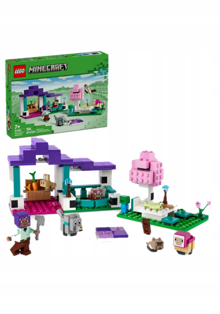 Цей набір тварин із рівнини простої складається з трьох місць: огородженого майданчика з воротами та коморою, повною тваринницькою їжею, включаючи кістки, моркву та пшеницю, простір для пікніка з столом під деревом та a килим, де втомлені тварини можуть втомитися відпочивати. Окрім няні для тварин, EFE, наборі також входять невеликі мафії: кіт, малинова вівця, вовк, кролик, корова ... і навіть невеликий зомбі з Minecraft. Цей конструкційний набір Lego Minecraft - це чудова ідея подарунка для дітей та любителів тварин. Це спонукає грати ролі та легко поєднується з іншими наборами Lego Minecraft (продається окремо). Додаткова цифрова забава надається програмою Lego Builder, яка дозволяє збільшити та обертати моделі в 3D, а також відстежувати свій прогрес