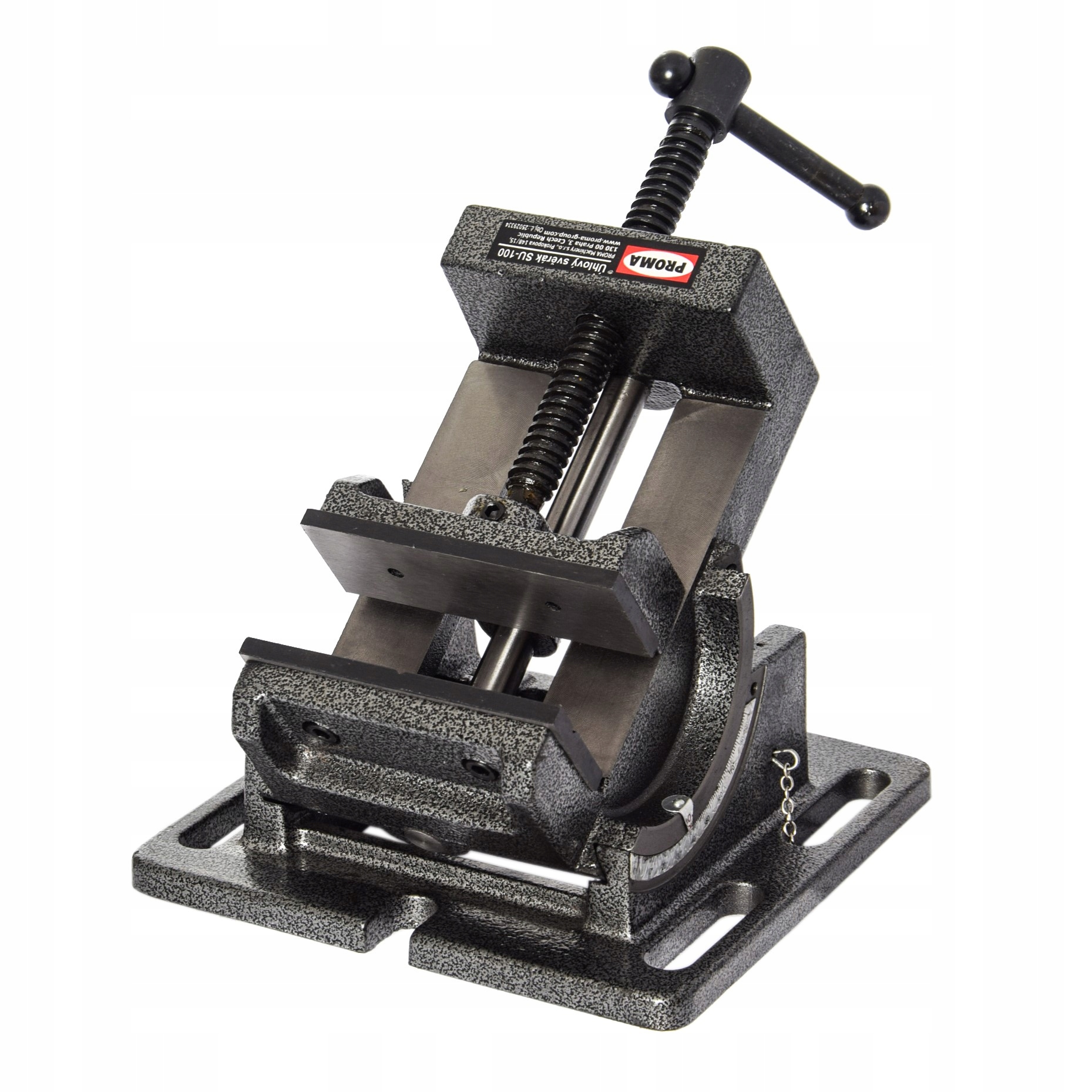 Верстатні лещата PROMAз шириною губки 100 мм. Використовується для кріплення елементів під час свердління. Його можна нахиляти від 0 до 90°. Кріпиться до столу гвинтами M10.