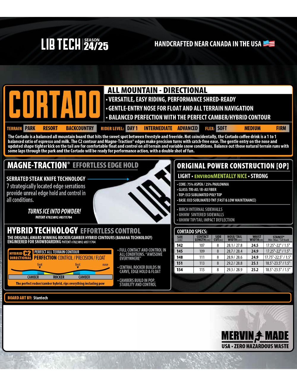 Кортадо - це модель, обрана сноубордистами, повністю усвідомлюючи свої навички, які шукають універсальну водійську дошку на всьому курорті. Гібридний профіль С2, який є поєднанням рокера між прив'язками та довшою камерою під зоною зв'язку, змушує дошку легко поставити на поворот, а довший ніс дощок зробить водіння відразу після того, як свіже падіння буде ще приємнішим.