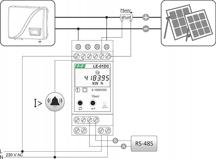 LE-01DC — електронний лічильник, призначений для вимірювання споживання електроенергії в ланцюгах постійного струму.