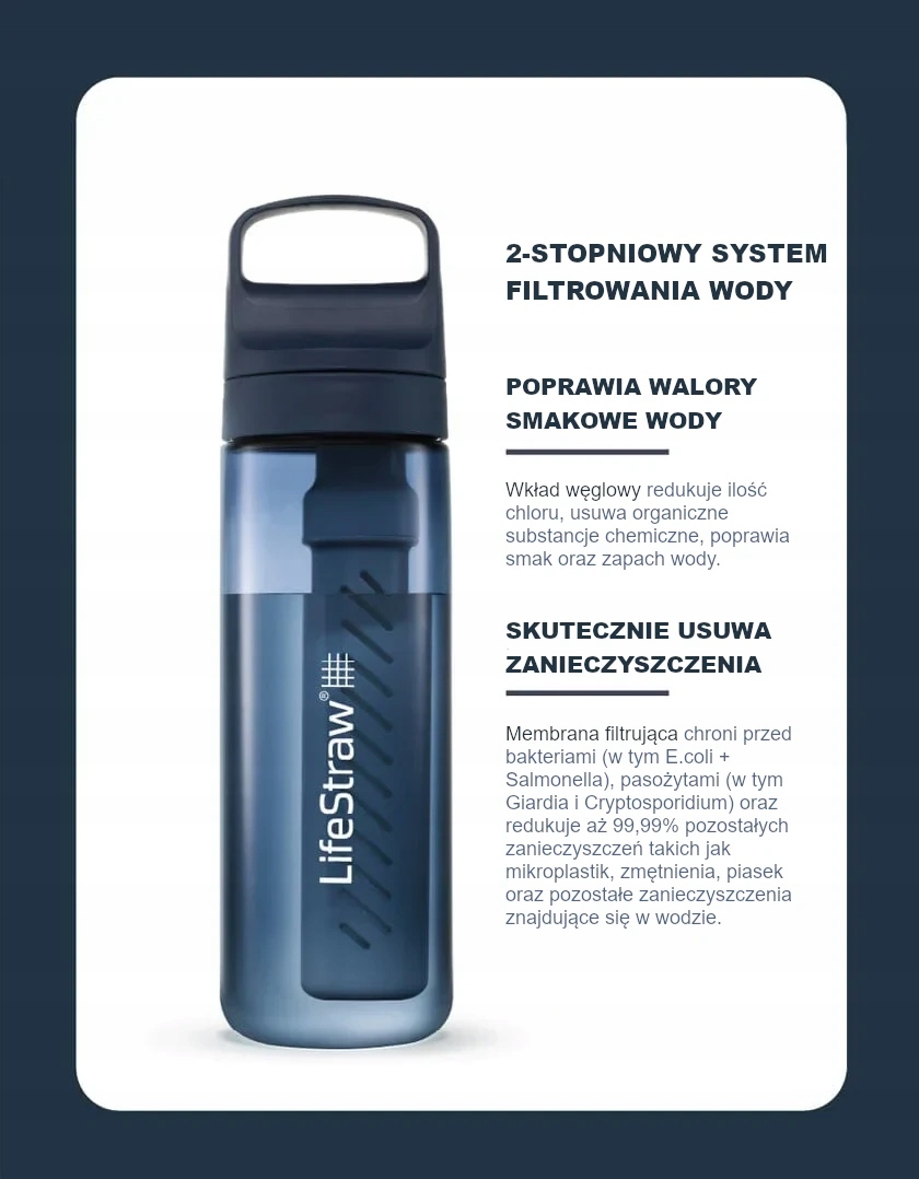 Ці три фрази ідеально описують продукт LifeStraw, пляшка для води призначена для свідомих і найвимогливіших користувачів . Пляшка з фільтром для води має місткість 650 мл (22 унції) і має ідеальну форму для зручного тримання. Його розміри 28 см у висоту і 8 см в діаметрі. Пляшка для води виготовлена з Recyclon, матеріалу, який не містить шкідливих сполук BPA. Заради збереження навколишнього середовища матеріали, які використовуються у виробництві, на 50% переробляються. Пляшка для води з ручкою, вбудованою в кришку, є надзвичайно зручним і практичним рішенням. Туристичний фільтр для води можна зручно носити в руці або прикріпити, наприклад, до рюкзака або сумки за допомогою карабіна. Це рішення все частіше використовують виробники пляшок з фільтрами для води. Завдяки унікальному дизайну та різноманіттю кольорів продукт LifeStraw знаходить своїх прихильників у різних вікових групах та тих, хто представляє різні вподобання.