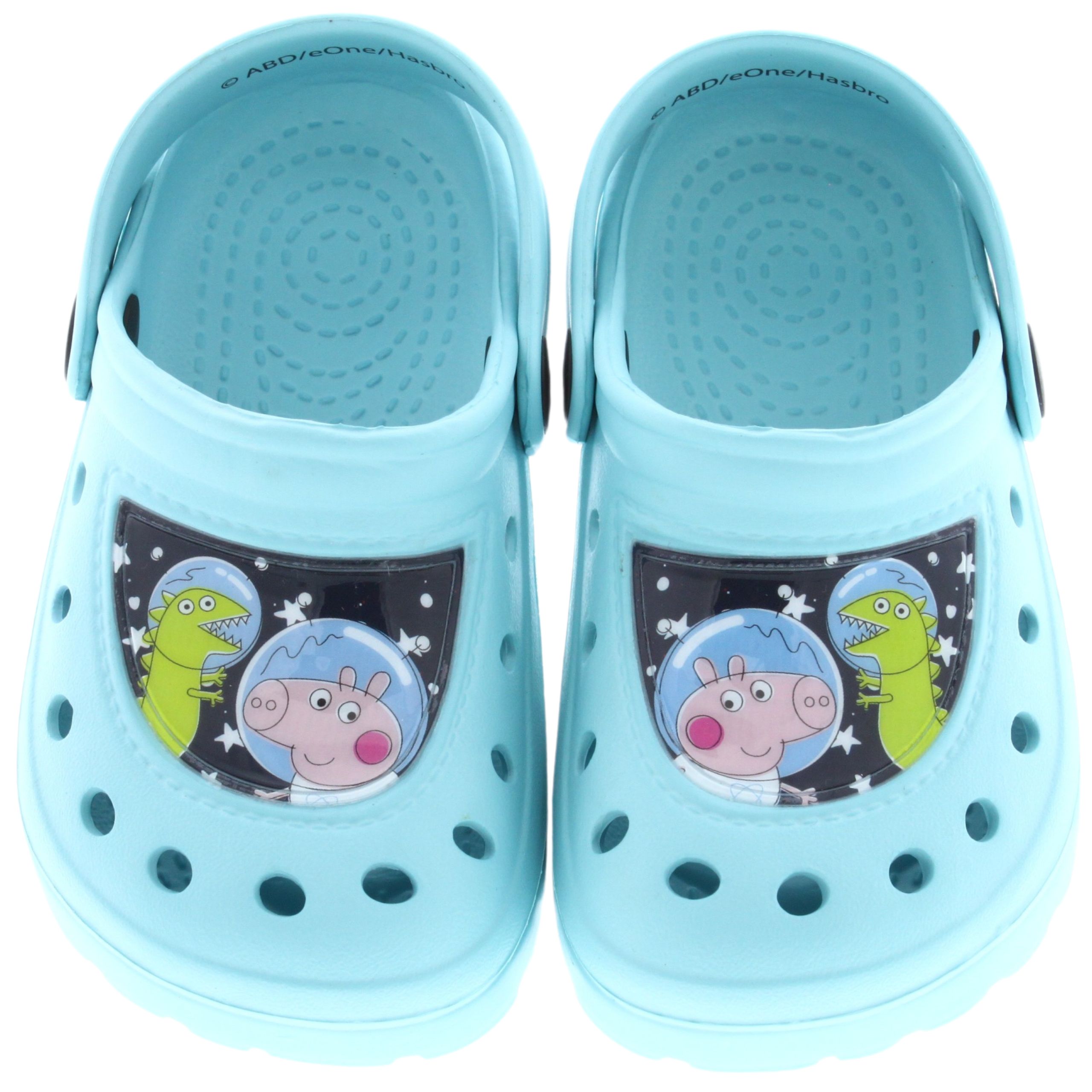 Ці світло-бірюзові шльопанці не лише забезпечують комфорт під час щоденних ігор, а й додають трохи чарівництва кожному кроці. Натхненні популярним мультсеріалом, ці шльопанці зображують улюблених персонажів Свинки Пеппи у веселому та барвистому дизайні.