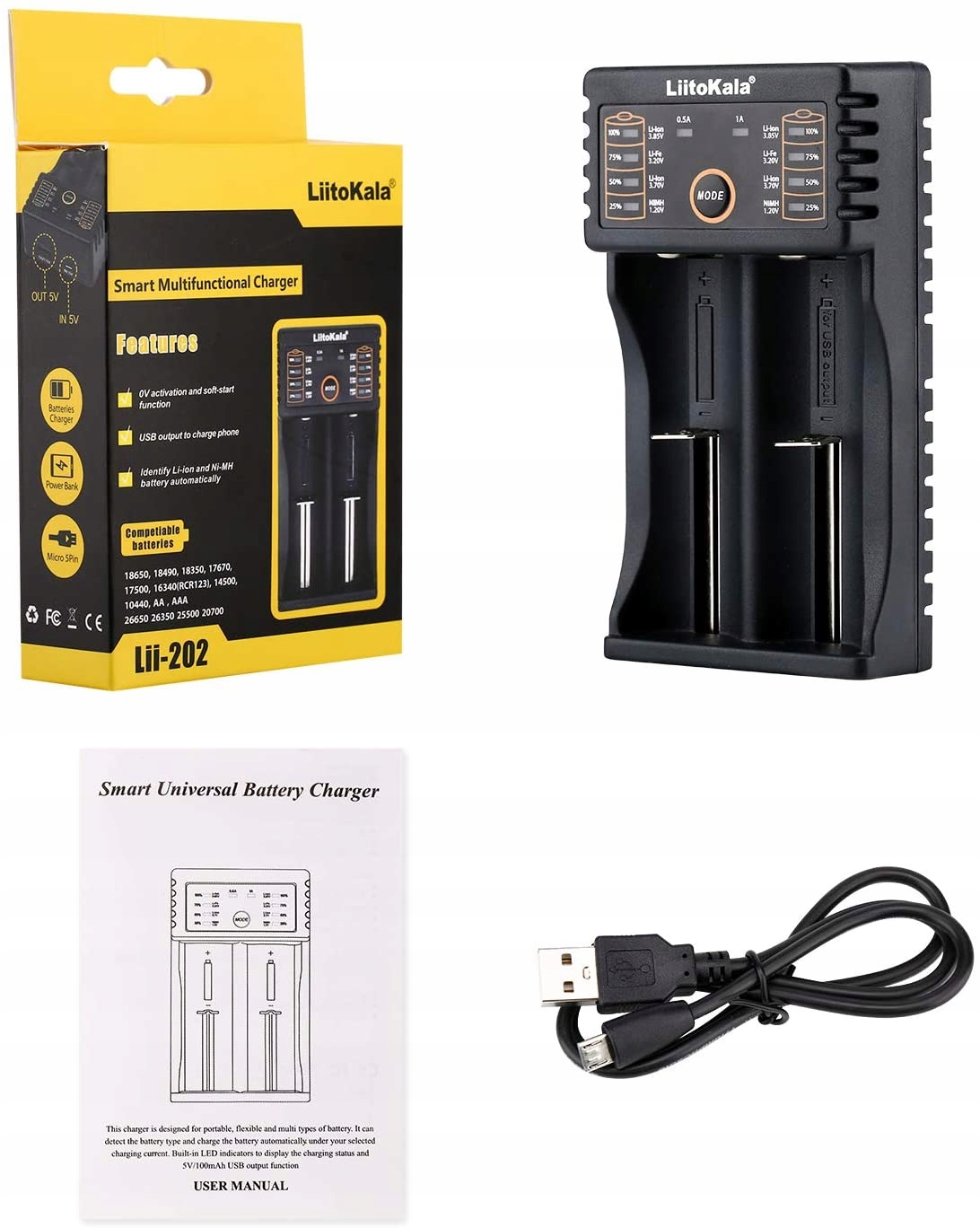 Зарядник процесора може виявити тип акумулятора та завантажувати акумулятор автоматично під вибраним струмом зарядки. LII-202 має вхідний порт Micro USB та загальний вихідний порт USB. Завдяки світлодіодним показникам ви можете чітко прочитати процес зарядки.