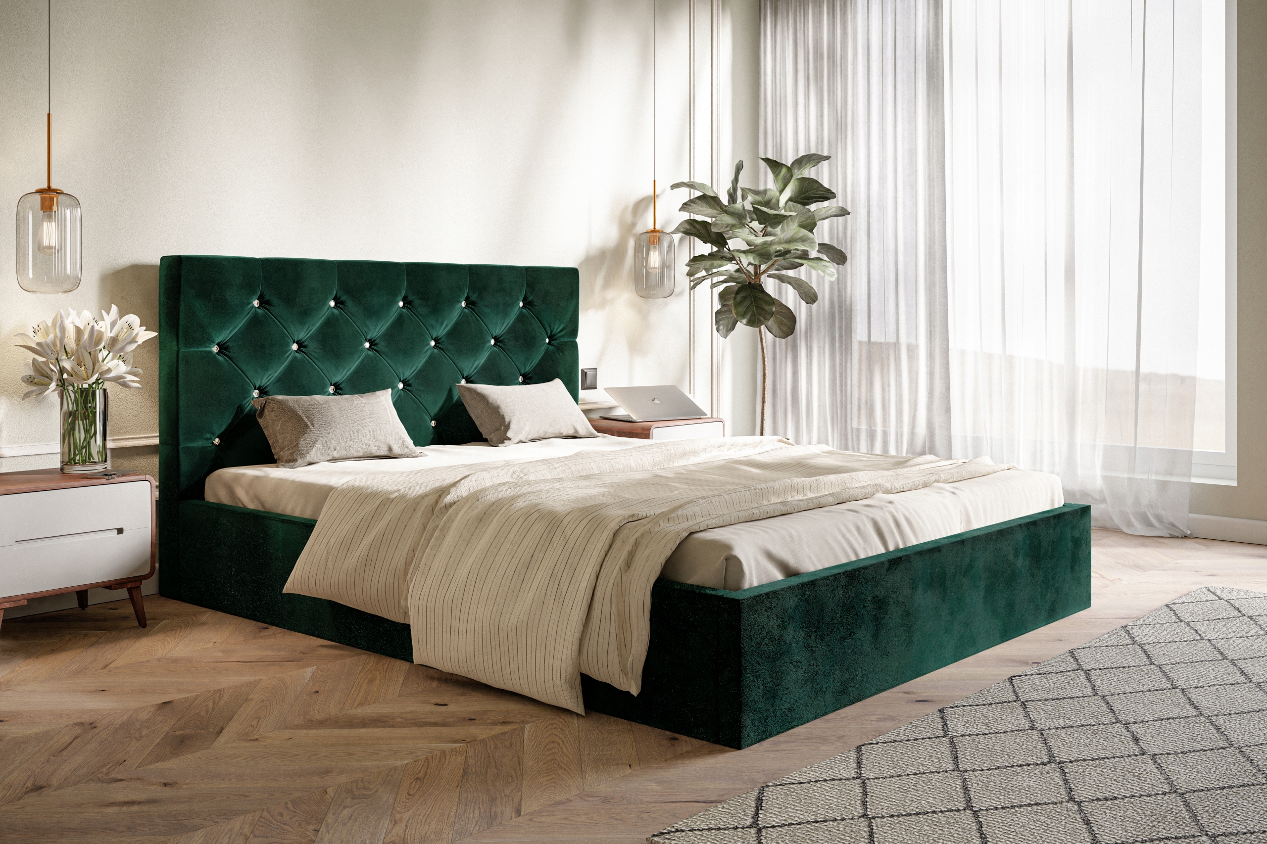На візуалізації показано ліжко 160х200 зі стандартною висотою підголівника. Залежно від конфігурації кількість кристалів на узголів'ї може відрізнятися.
