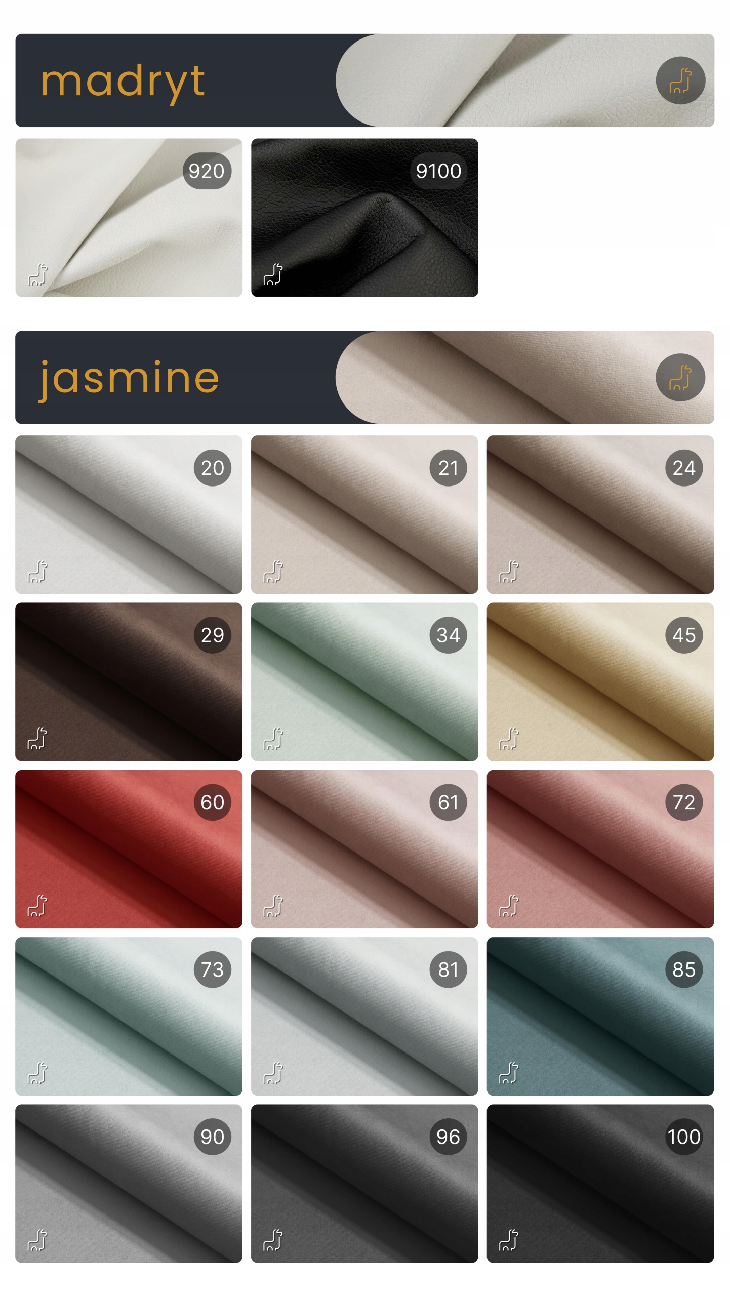 Тканина ЖАСМИН стійка до стирання, дуже міцний, надзвичайно м’який і доступний у натуральній гамі кольорів. Це плюш, тому тканина «розчісується з волоссям» і приємна на дотик.