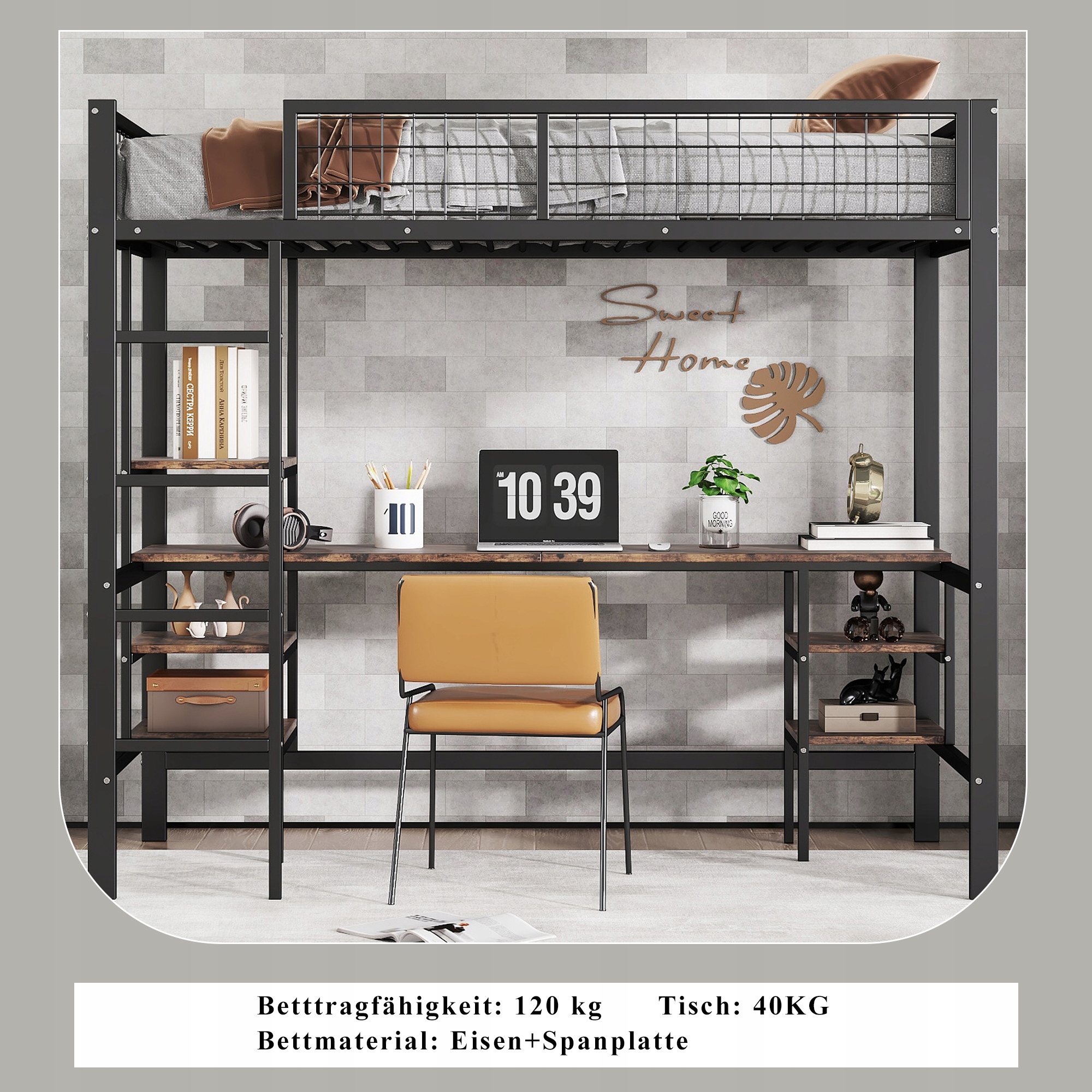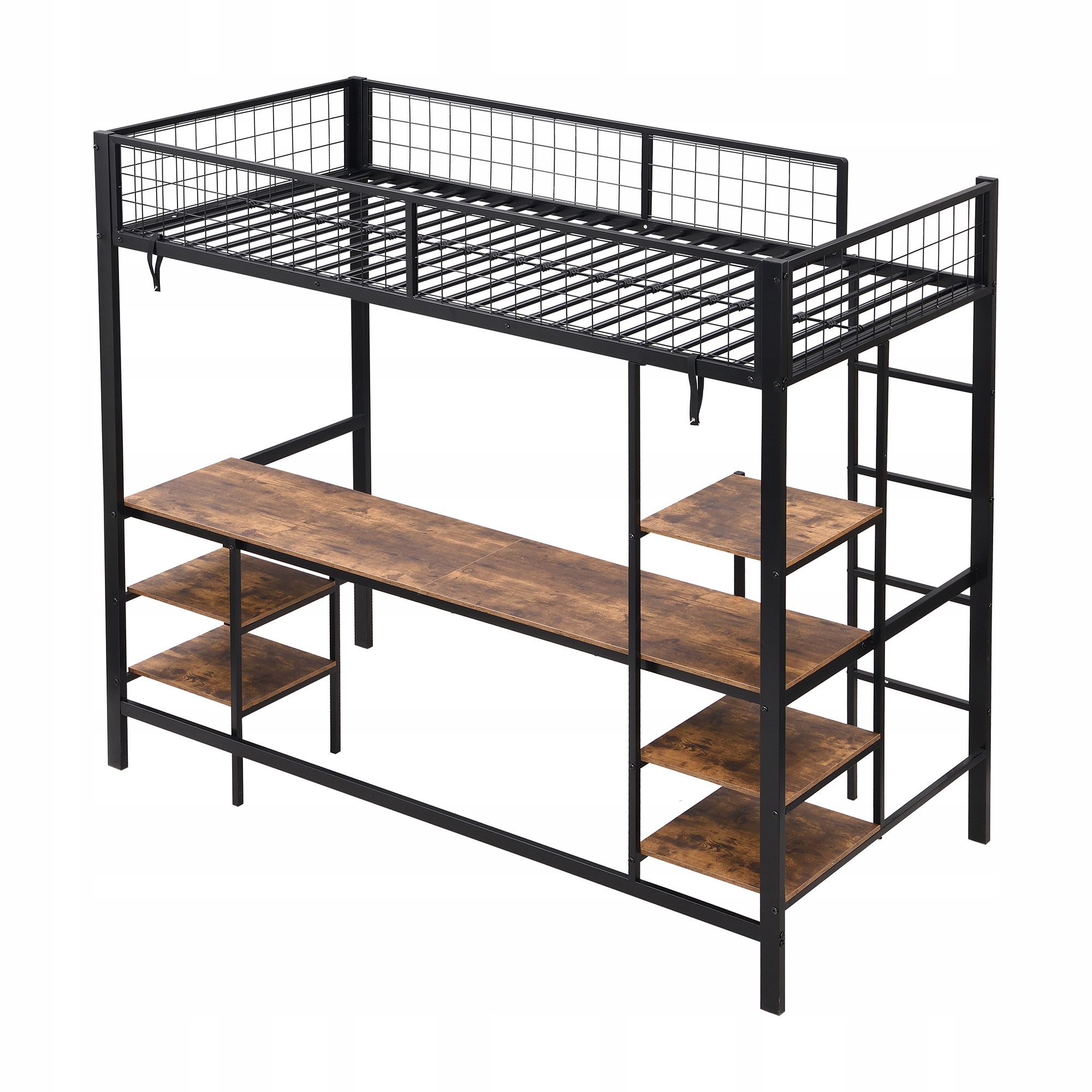 Ліжко залізне, двоярусне, дитяче та підліткове, зі столиком та полицею, з драбинкою на чотири ступі, праска + ДСП, чорний + темне дерево, 90х200 см