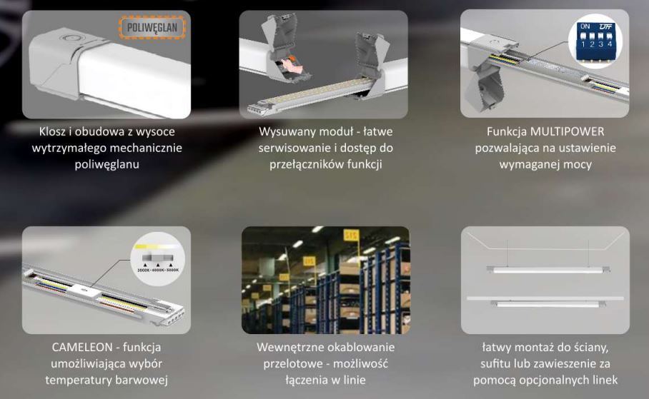 Щоб полегшити встановлення, обслуговування та використання функцій, світлодіодний модуль разом із роз’ємами та перемикачами висувається з корпусу світильника. Світильник простий в установці і може кріпитися різними способами - на поверхню до стіни або стелі, а також за допомогою додаткових кабелів через підвіс. Завдяки використанню наскрізної проводки всередині світильника, він готовий до з’єднання в лінії.