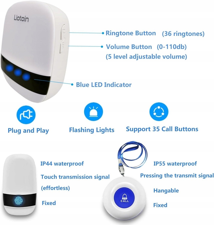 - Багатофункціональний дзвінок: підключіть пейджер медсестри, підключіть і працюйте з 36 різними мелодіями на вибір (включаючи дзвінки будильника), 5 -ступеневе регулювання гучності (від 0 децибел до 110 децибел).
