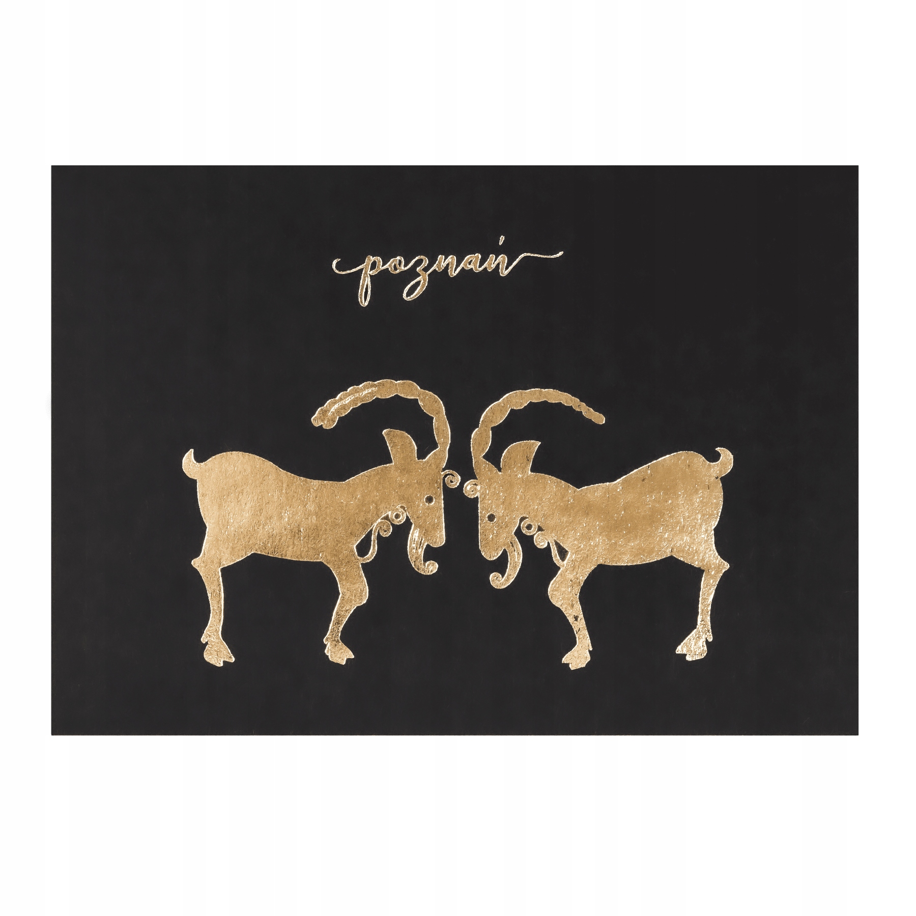 Чорна листівка з познанськими козами. Візерунок тиснений золотою фольгою. Реверс — крем.