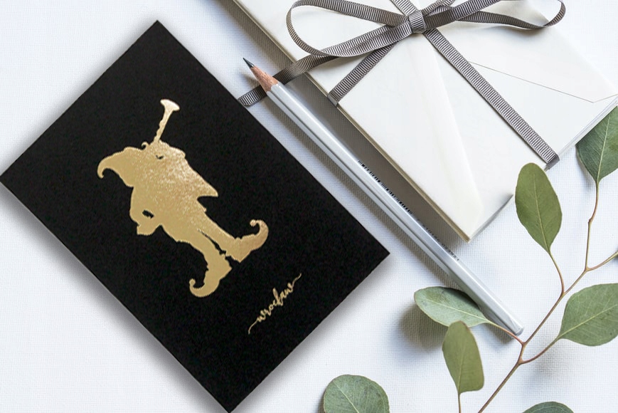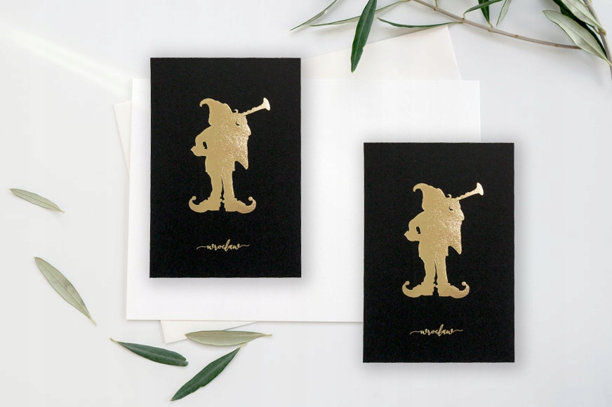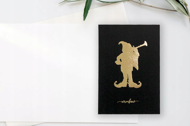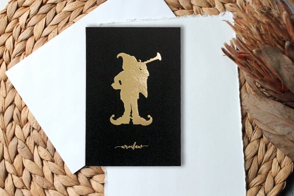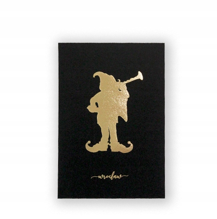 Чорна листівка із зображенням карлика з вузловим із трубою. Візерунок, тиснена золотою фольгою. Зворотний колір крему.
