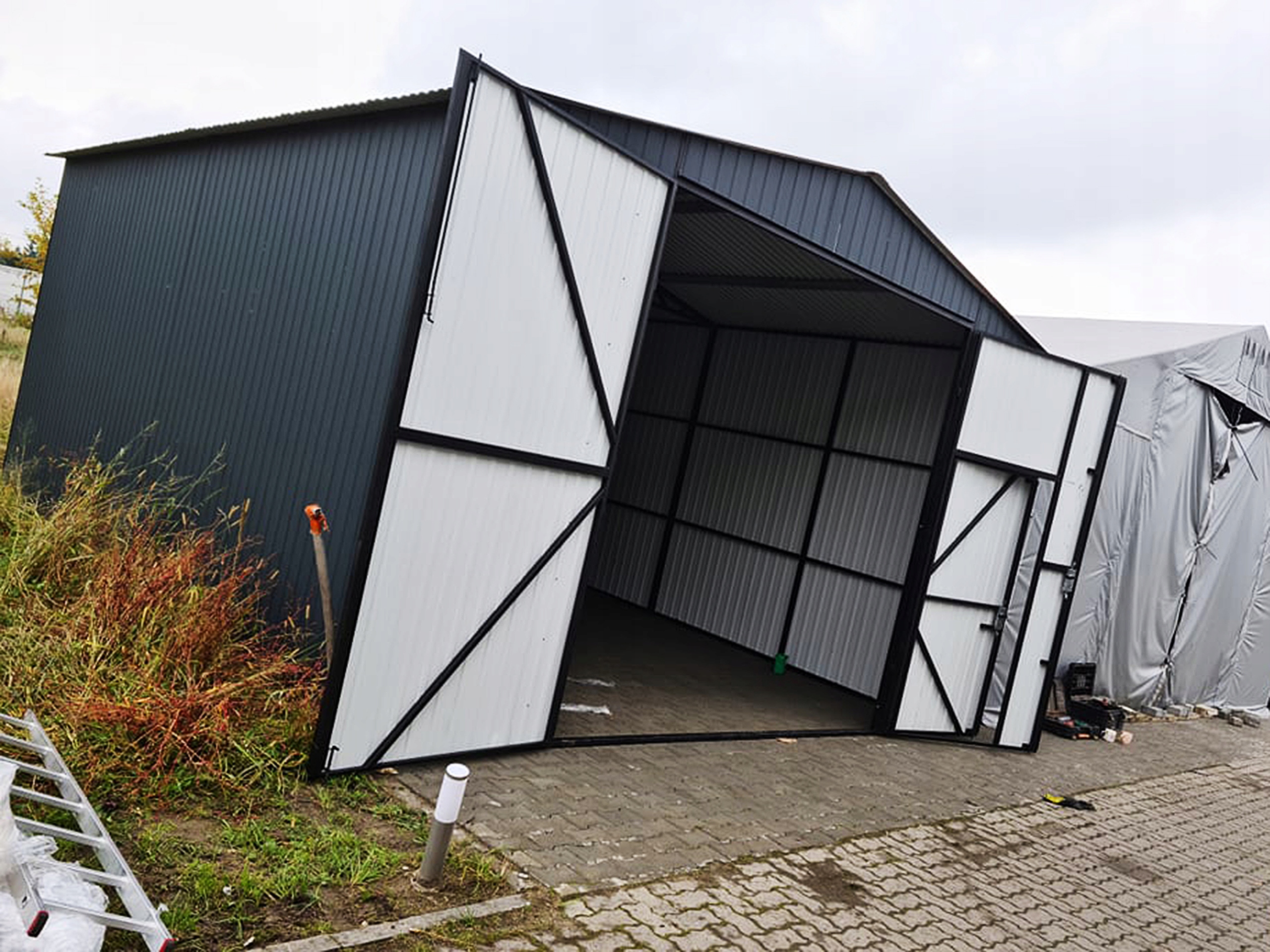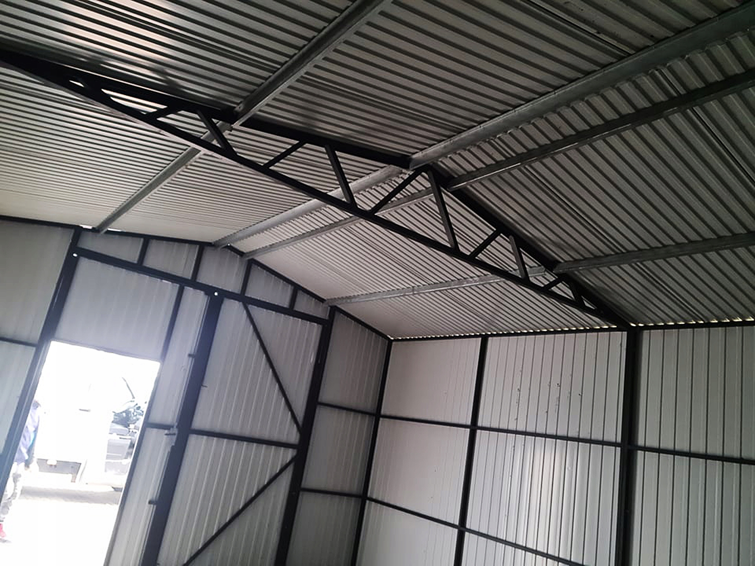 Покрівля виконується із закритих профільних ферм, це означає, що всі навантаження рівномірно розподіляються на конструкції холу та стіни. Для стін використовували також замкнуті профілі, які додатково зміцнювали горизонтальними кріпленнями. Весь гараж з жерсті покритий першим сортом оцинкованого металу. Кожен елемент можна покрити будь-яким кольором із палітри кольорів на аукціоні.