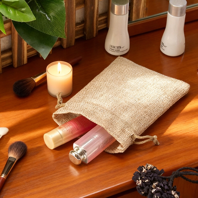 Потягніть лляний мішечок за шнурок і він готовий! Джутовий мішок складається в милу форму.