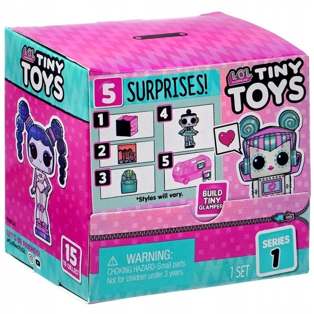 Tiny Toys — це нова серія від всесвітньо популярного бренду L.O.L. Сюрприз. Кожна коробка містить міні-ляльку-робота з п’ятьма аксесуарами, включаючи один збірний мініатюрний елемент для кемпера (інші елементи можна знайти в інших коробках).Кожна лялька має знімне волосся, яке також можна замінити іншими ляльками. Іграшка розміщена в спеціальному кубі, який можна поєднувати з іншими кубиками, створюючи дивовижні конструкції, які також можна використовувати як колекційний дисплей.