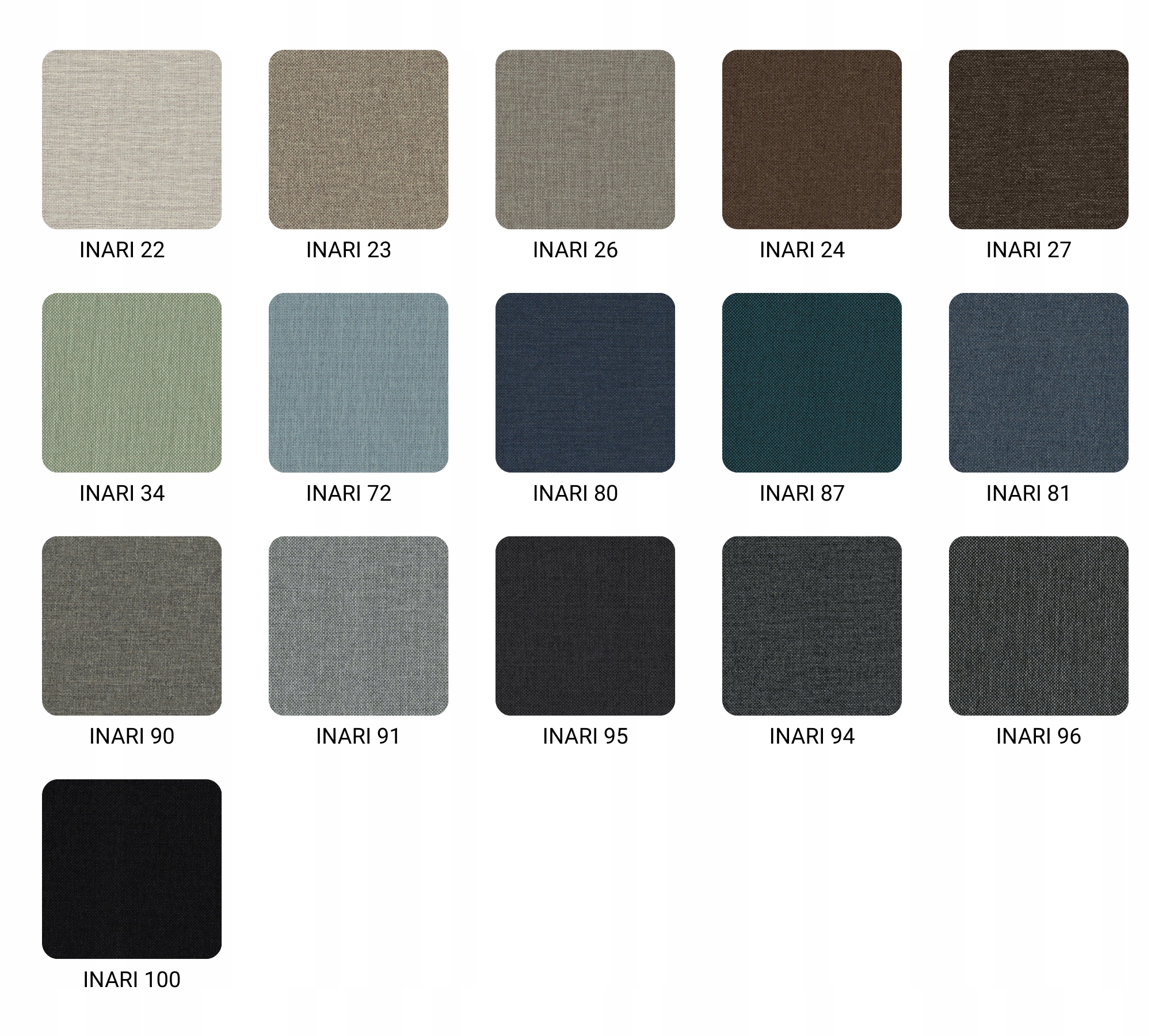 INARI - структурна меблева тканина, необроблена, злегка шорстка на дотик, що імітує натуральний льон, середньої товщини. Оббивна тканина з простим і міцним переплетенням робить її ідеальним матеріалом для щоденного використання та дуже добре підходить для їдальні. Він стійкий до стирання і прослужить багато років, що характерно для плетених шнурів. Має високу стійкість до вицвітання.