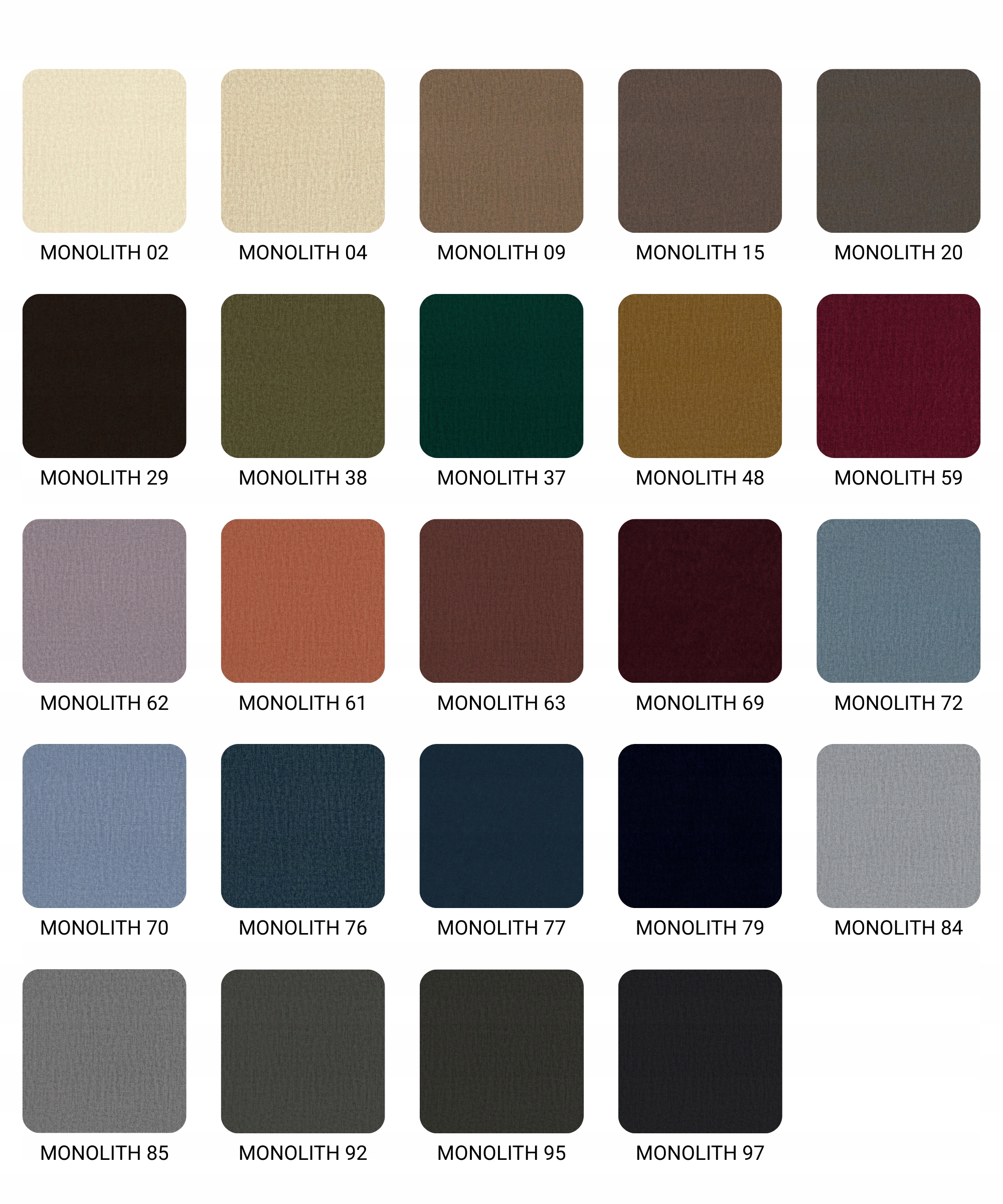 Моноліт - міцний і водночас приємний на дотик оббивний матеріал. Збагачений спеціальним гібридним покриттям, яке захищає від проникнення рідини в структуру тканини. Цей приємний і міцний матеріал ідеально підходить для будь-якого будинку і громадського приміщення. Це також чудова тканина для дітей і стійкий до тварин.