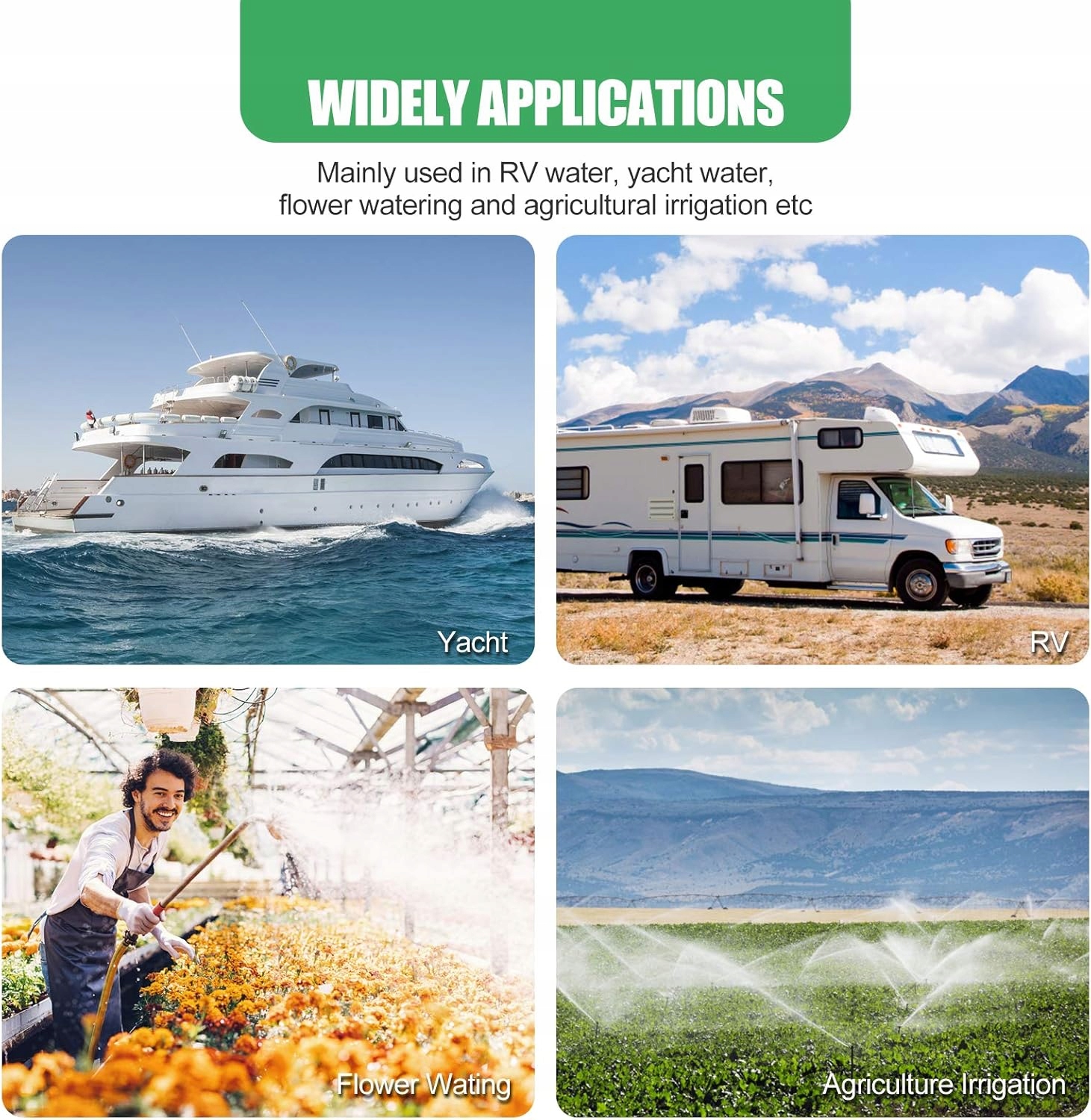 - Каравани та будинки на колесах: забезпечує постійний доступ до води під тиском, ідеально підходить для водопостачання в транспортних засобах для кемпінгу. li>