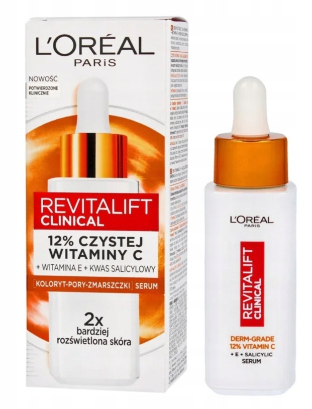 клінічна сироватка обличчя L'Oréal Revitift - це сироватка з високою концентрацією (12%) чистого вітаміну С, створена для поліпшення стану шкіри обличчя. Він має ефект проти використання, зменшуючи видимість зморшок, нерівності тону шкіри та розширених пор. Завдяки властивостям вітаміну С сироватка освітлює шкіру, надаючи їй здорове сяйво, а саліцилова кислота містила акуратно відлущує епідерміс, згладжуючи текстуру шкіри.