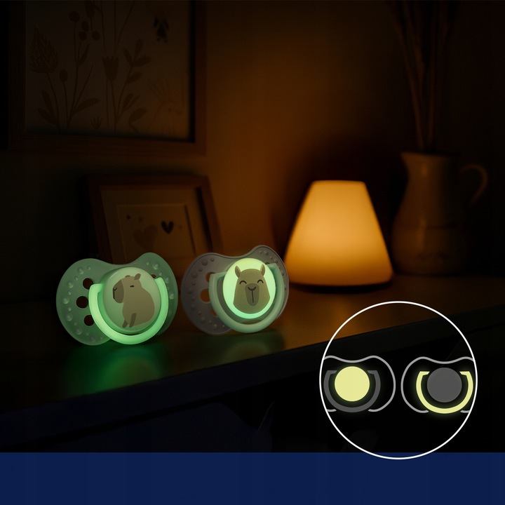 Одна з пустушок у наборі має ручку, а друга має ковпачок, що світиться в темряві, що полегшує пошук соски вночі.