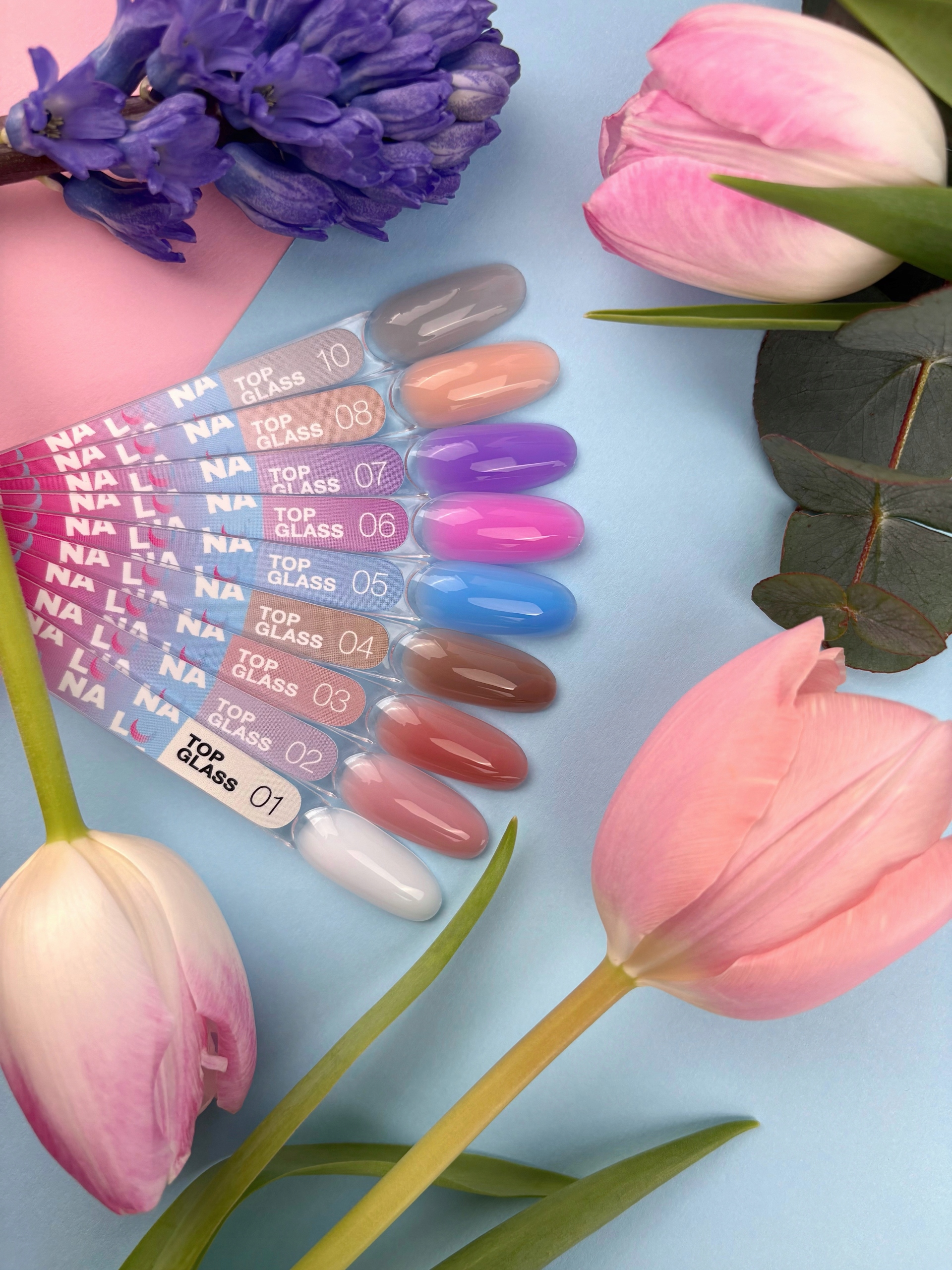 Верхнє скло - це барвистий верх без липкого шару, який зберігає блиск до 4 тижнів. Скляні вершини мають широкий асортимент наймодніших відтінків для кожного смаку.