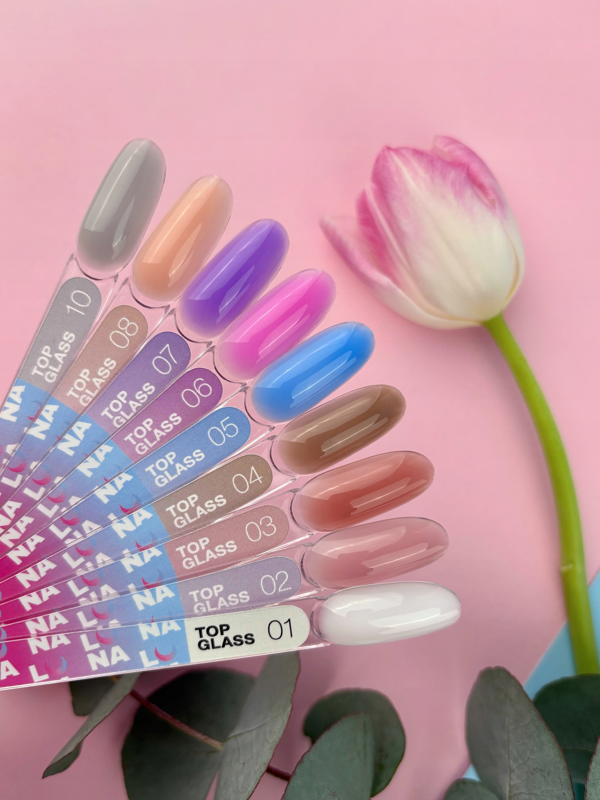 Верхнє скло - це барвистий верх без липкого шару, який зберігає блиск до 4 тижнів. Скляні вершини мають широкий асортимент наймодніших відтінків для кожного смаку.