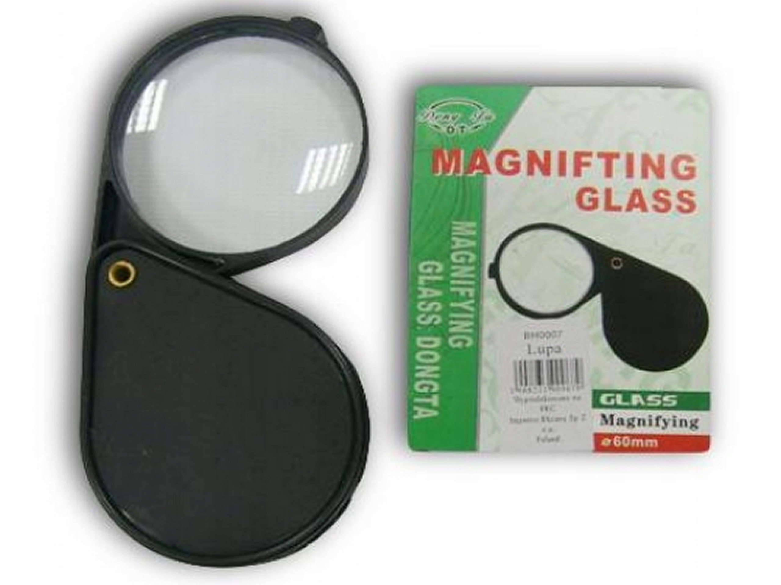 Збільшувальні скла та лупи корисні не лише в повсякденному житті під час читання газет, літератури чи етикеток. Це також базовий елемент туристичного спорядження - полегшує читання топографічних карт, можна розвести багаття тощо. Маленький і легкий, поміститься в будь-якій кишені або сумці. Також чудово підходить для освітніх заходів. Збільшенняприблизно 3x. Ця лупа має діаметр 60 мм і складається з міцної рами та пластикової або скляної лінзи. Лупи мають різну упаковку.