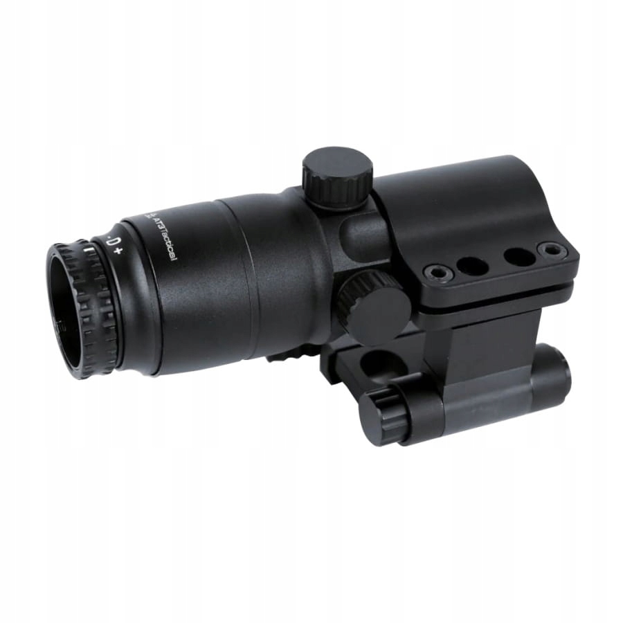 Тандемна система коліматор-збільшувач є надзвичайно популярним рішенням, головним чином завдяки своїй гнучкості. Завдяки поворотному кріпленню пристрій легко розташовується на осі коліматора, забезпечуючи 4-кратне збільшення і можливість комфортного ведення вогню на середні відстані. Коли пристрій не використовується, він зручно лежить на боці рушниці, не обмежуючи поле зору при прицілюванні. У пристрої використовується високоякісна оптика, покрита багатошаровими покриттями, значно підвищують контрастність і світлопроникність, забезпечуючи відмінну якість зображення. Завдяки регулюванню в окулярі можна швидко і зручно налаштувати фокус на відстань.