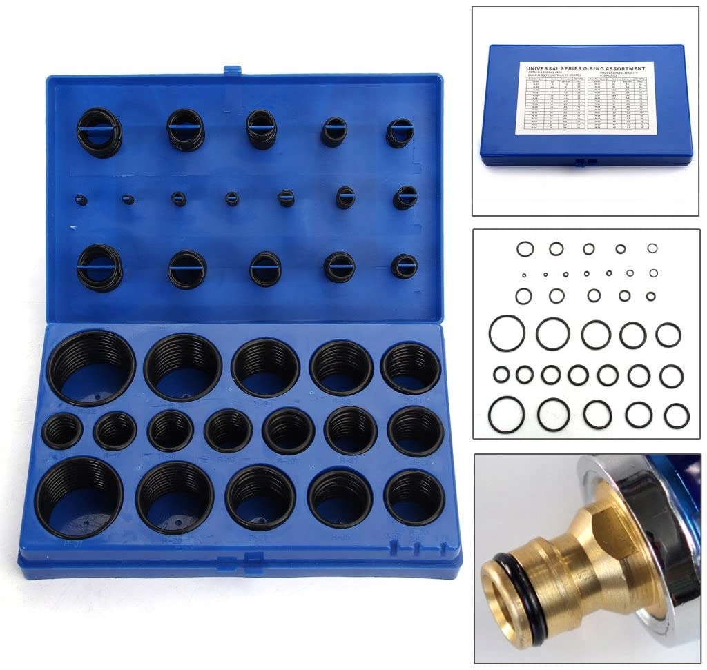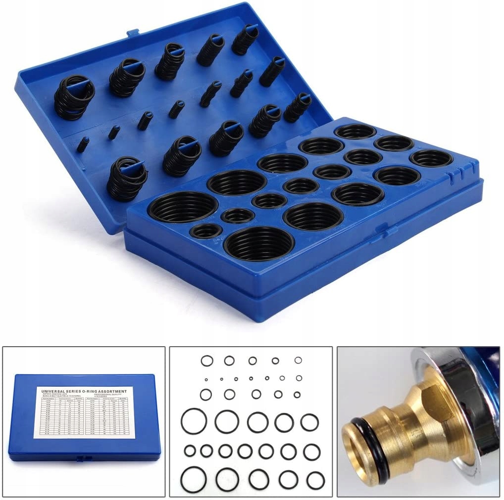 Великий, універсальний набір, необхідний у кожному домі, майстерні та гаражі. Стійкі до дії кислоти, бензину, тепла та масла, а також високої температури до +250°C. . Набір знаходиться в пластиковій валізі, де кожен розмір має своє точно описане місце. Кожен розмір описується відповідним символом, завдяки доданій таблиці ви можете знайти розміри кожного ущільнення.
