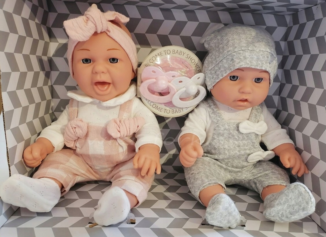 Чарівні близнюки, вони схожі на маленьку дитину. Він напевно зігріє серця багатьох маленьких дівчаток. Набір гарних рожево-білих/сіро-білих кольорів. Крім ляльки, в нього входять дві соски: біла і рожева.