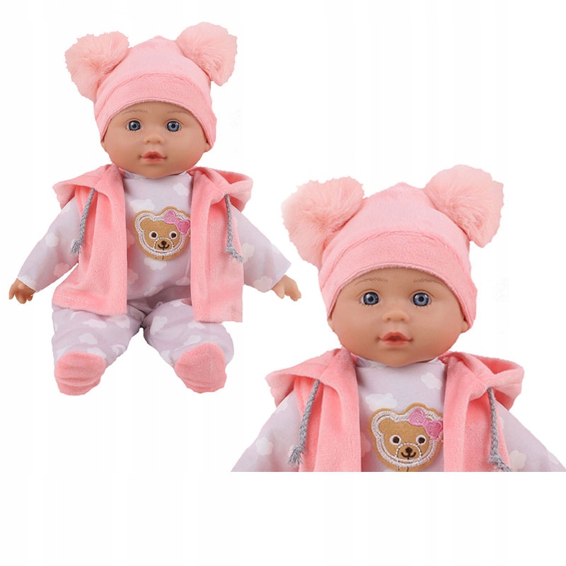 Лялька Юлька вчить дітей турботі та чуйності, її можна брати з собою на прогулянку. М'яка лялька одягнена в красиву м'яку велюрову шапочку з пухнастими абрикосовими помпонами, білі комбінезони-хмаринки з аплікацією у вигляді ведмедика та теплу оксамитову безрукавку з капюшоном в колір шапочки.