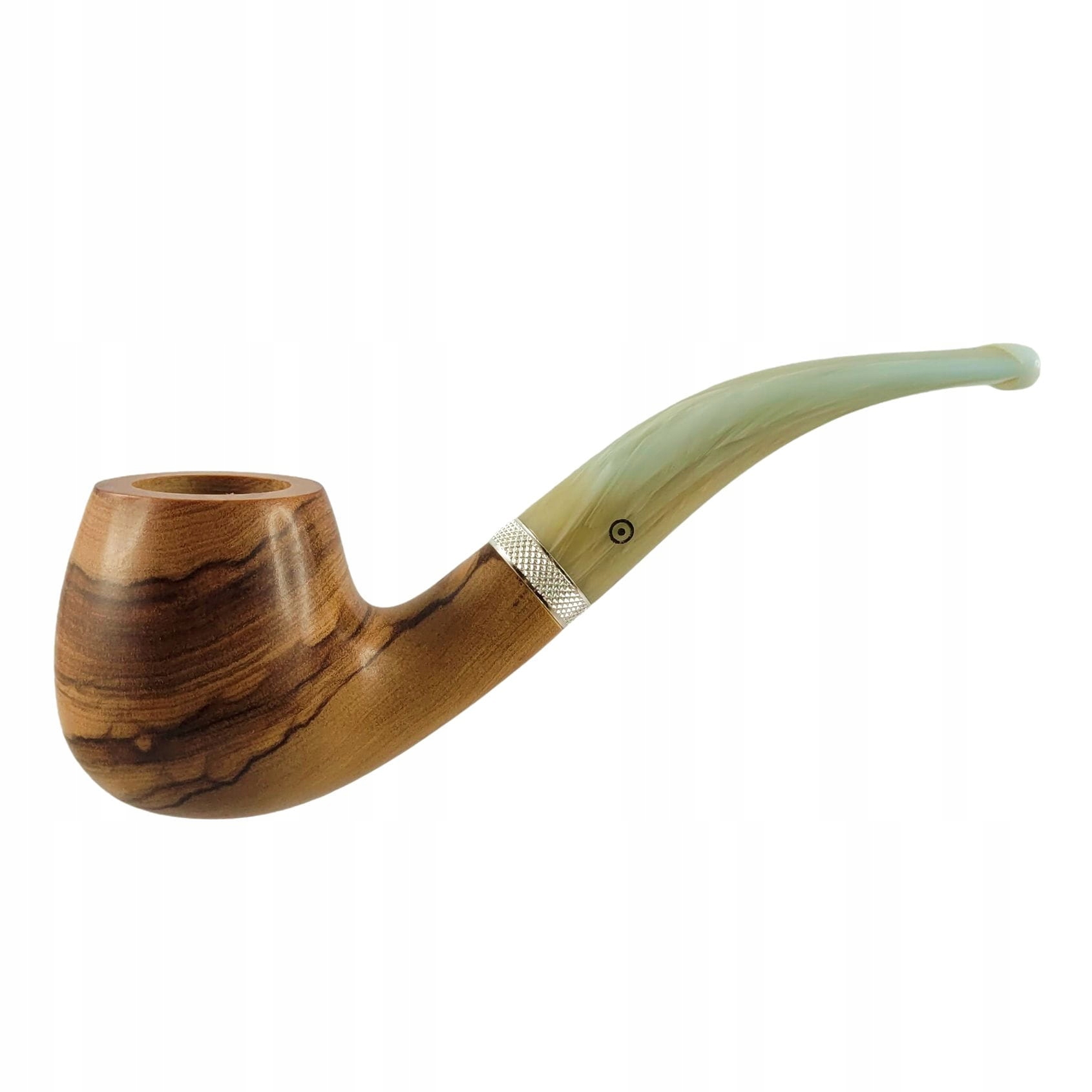Класична люлька для тютюну, ручна робота з італійського оливкового дерева. Легкий і стрункий у стилі зігнутого яблука, він має безпрекарбонатний камін зі стандартною потужністю. Поверхня люльки має натуральний колір, захищена твердим карнаубським воском - кожен шматок має унікальний малюнок зерна. Мундштук, підібраний за формою, кольором і малюнком до дерев'яної частини. Він виготовлений із міцного акрилу та має місце для змінних 9-міліметрових абсорбуючих фільтрів, які ми рекомендуємо замінювати щоразу після куріння. Посріблене кільце, що з'єднує мундштук з горловиною, додає елегантності. Завдяки своїм параметрам люлька підійде як досвідченим, так і початківцям курцям.