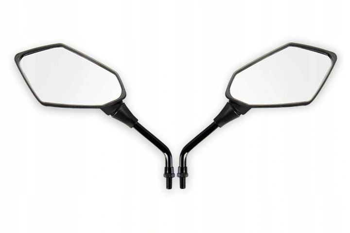 Дзеркала чорні матові з сучасний дизайн. Вони кріпляться на міцному металевому тримачі з діаметром різьби 10 мм. Вони мають можливість артикуляції кута огляду, завдяки чому можна індивідуально налаштувати параметри під свої потреби. Вони оснащені отворами для стоку води.